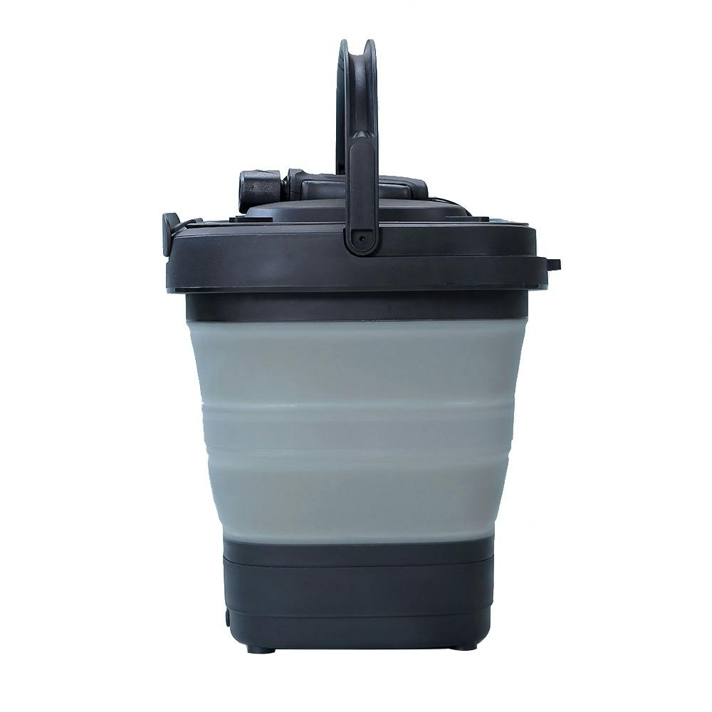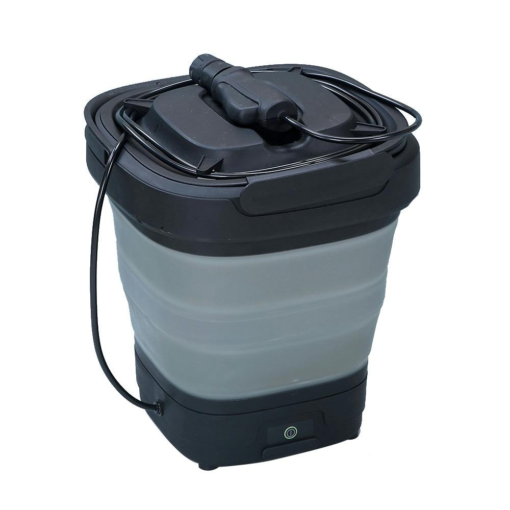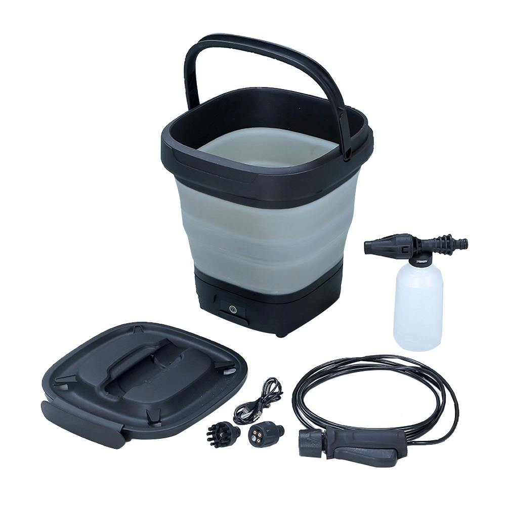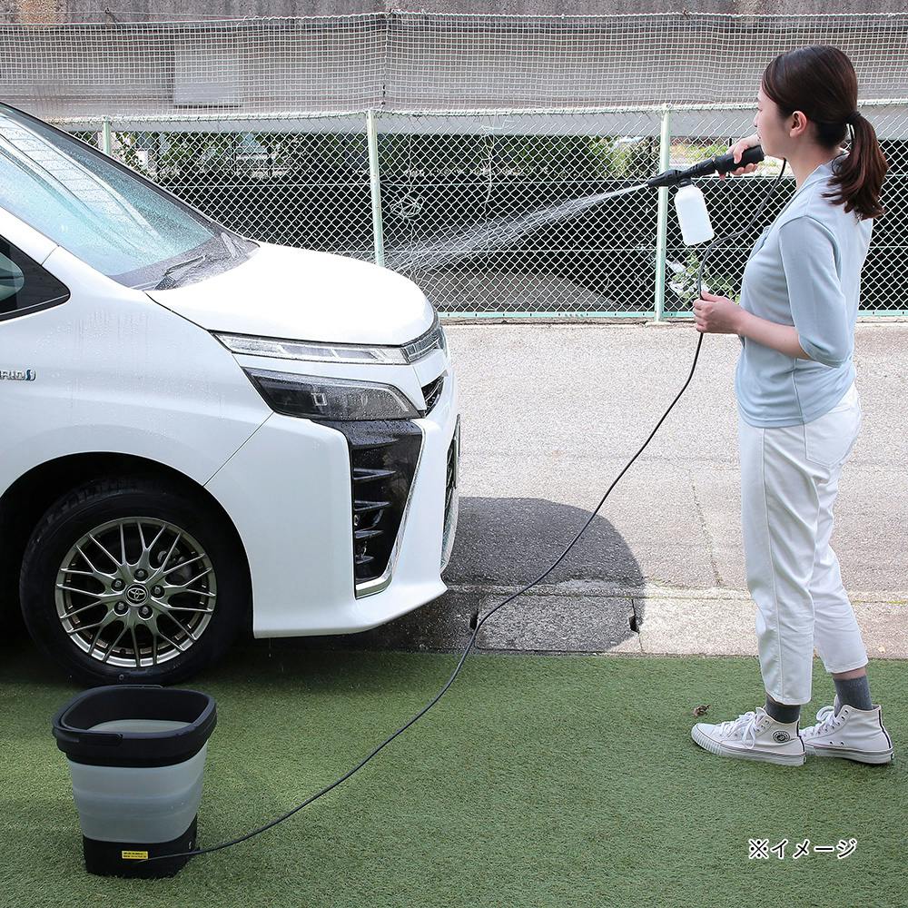 充電式&バケツ型で水源がない場所でも使える。気軽に持ち運びして、色々な場所で使いやすい。収納時はサイズがかなり小さくなり、玄関その他の隙間に収納可能。