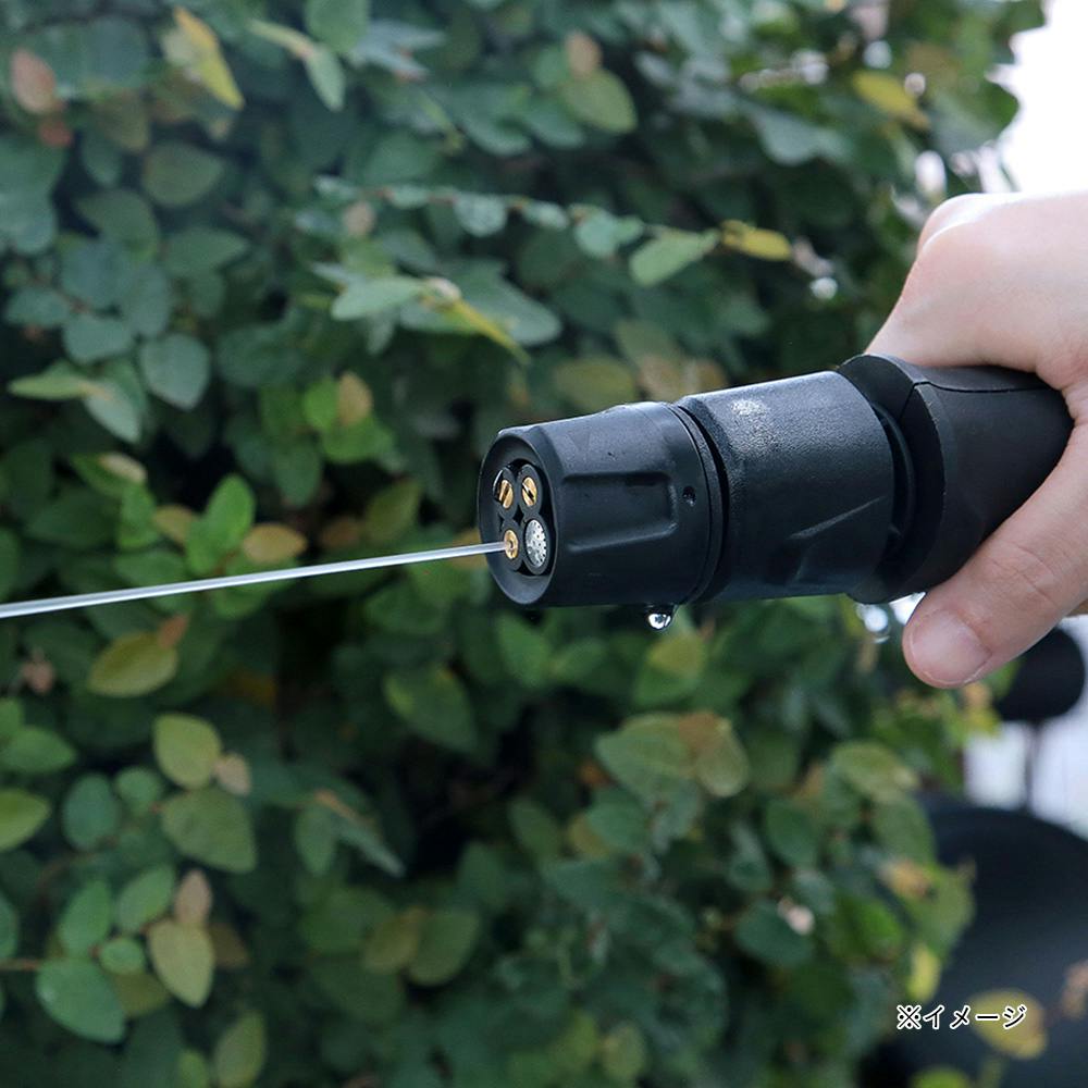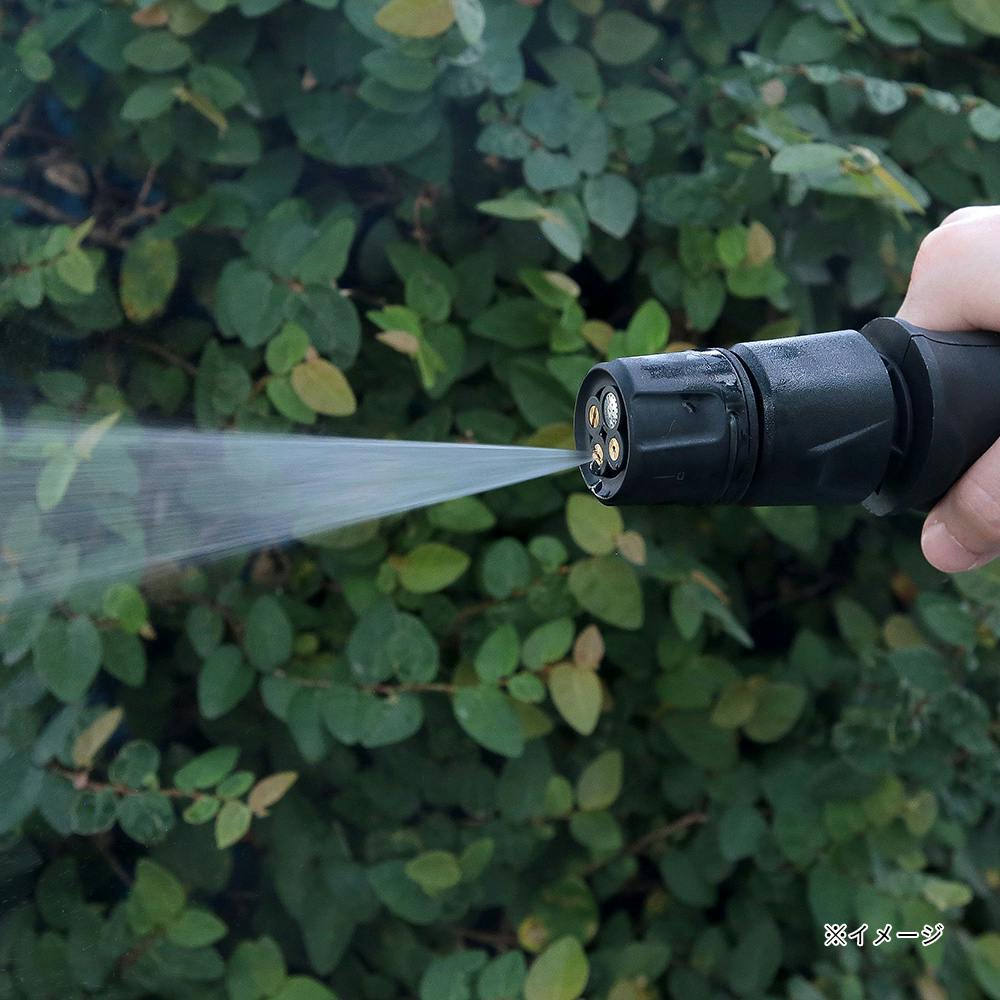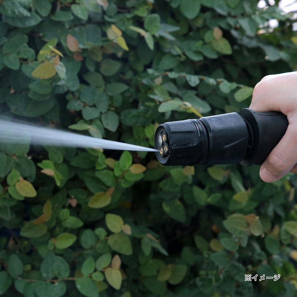 ・切替ノズルで簡単に4種類の散水パターンを切替可能。・家の外壁やタイルの磨き掃除が出来るブラシノズルが付属。・洗剤などを入れて使用する泡ボトルが付属。