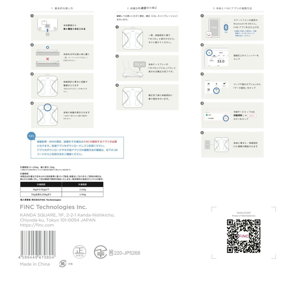 通信方式:Bluetooth 4.0、通信距離:約10m 動作温度範囲:5℃~40℃、動作湿度範囲:30%~90%(結露なきこと)、電源:単四電池 ×3個、同梱品:体組成計本体、単四電池×3個 データはFiNCアプリでのみ確認可能です。事前に携帯端末にFiNCアプリをダウンロード可能かご確認ください。