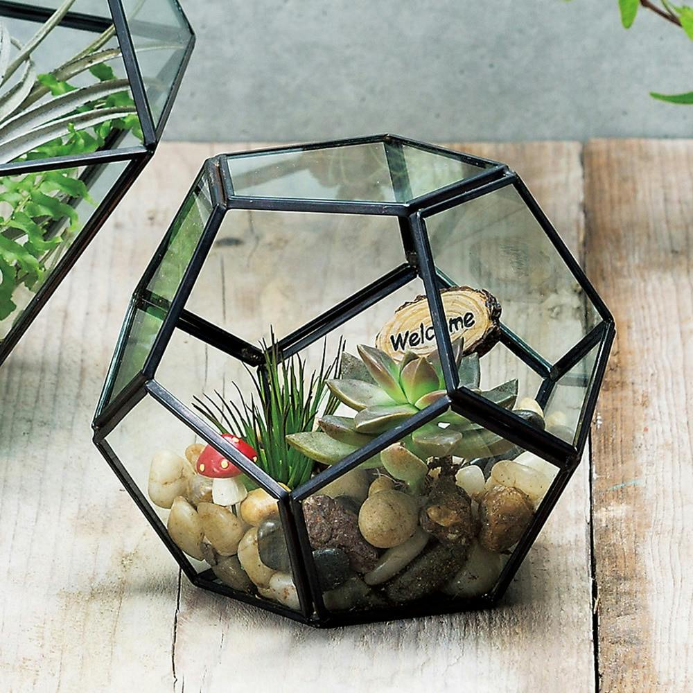 植物だけでなく、小さな雑貨などを飾るのが楽しくなる多角形のガラスベースです。