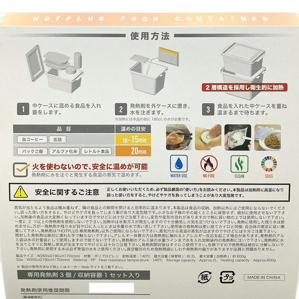専用発熱剤:3個、収納容器:1セット入。