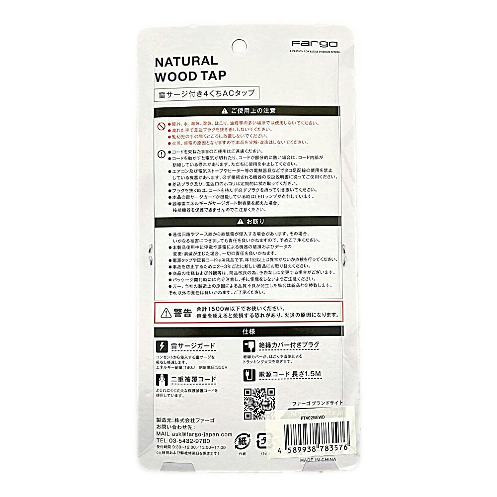 ファーゴ ナチュラルウッドタップ ベージュウッド 雷サージガード付 AC4個口 PT402BEWD