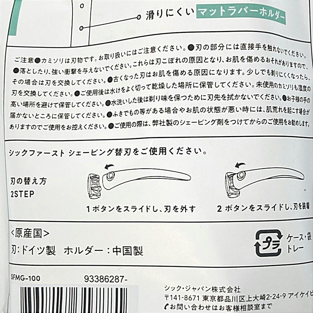 ●滑りにくいマットラバーホルダー ●カラー/ミントグリーン ●刃の替え方/1.ボタンをスライドし刃を外す 2.ボタンをスライドし刃を装着