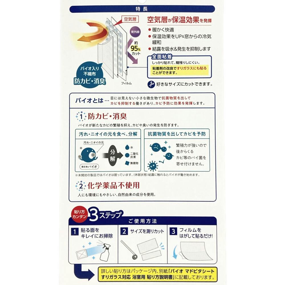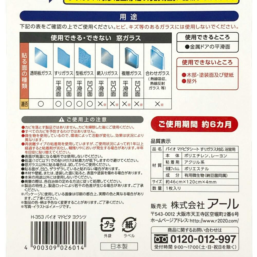 アール まど活 バイオ マドピタシート 水もテープいらない すりガラス対応 浴室用 防カビ+消臭 H-353 幅46cm 長さ120cm 1枚入