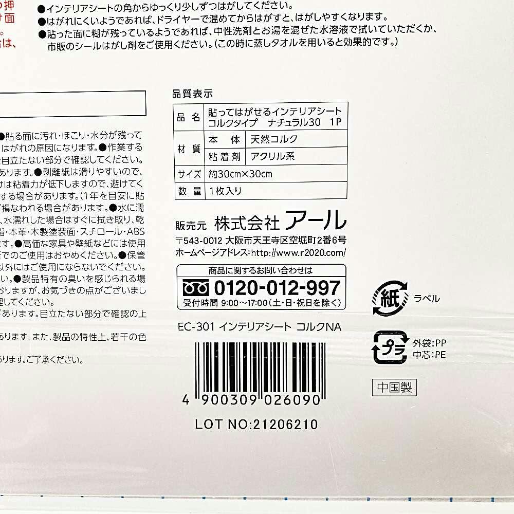貼ってはがせるシート1枚コルク30×30