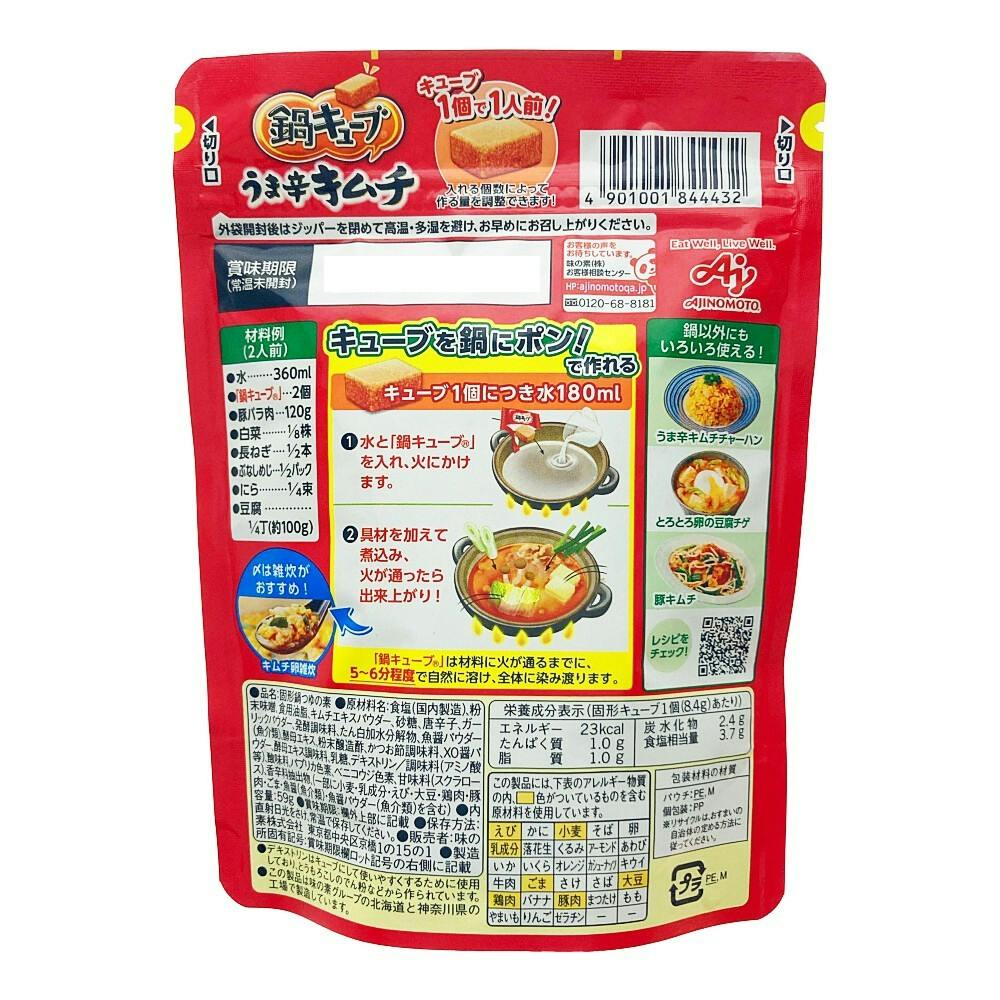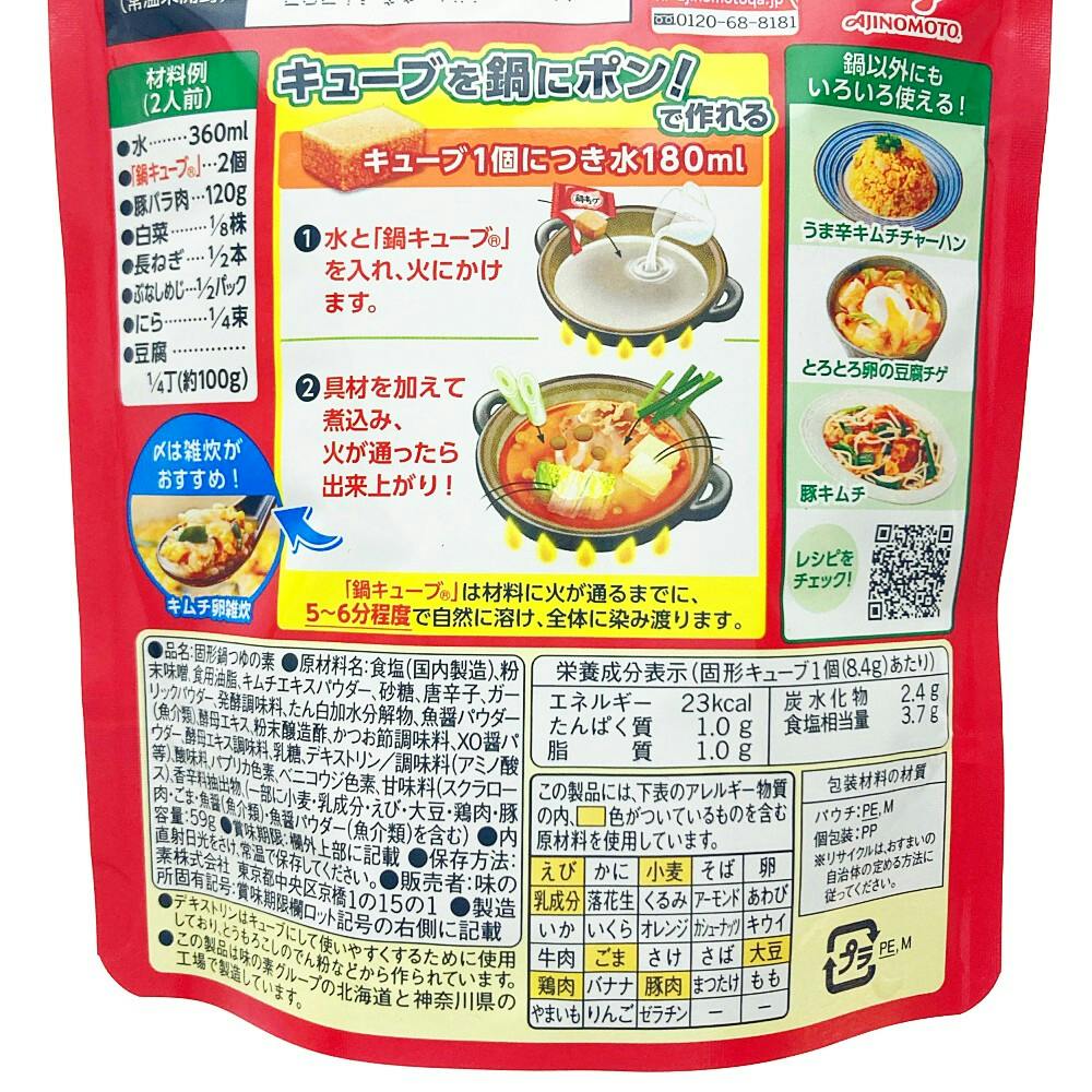 ●原材料名/食塩(国内製造)、粉末味噌、食用油脂、キムチエキスパウダー、など ●栄養成分表示(キューブ1個(8.4g)あたり)/エネルギー:23kcal、たんぱく質:1.0g、脂質:1.0g、炭水化物:2.4g、食塩相当量:3.7g ●アレルギー物質/えび、小麦、乳成分、ごま、大豆、鶏肉、豚肉