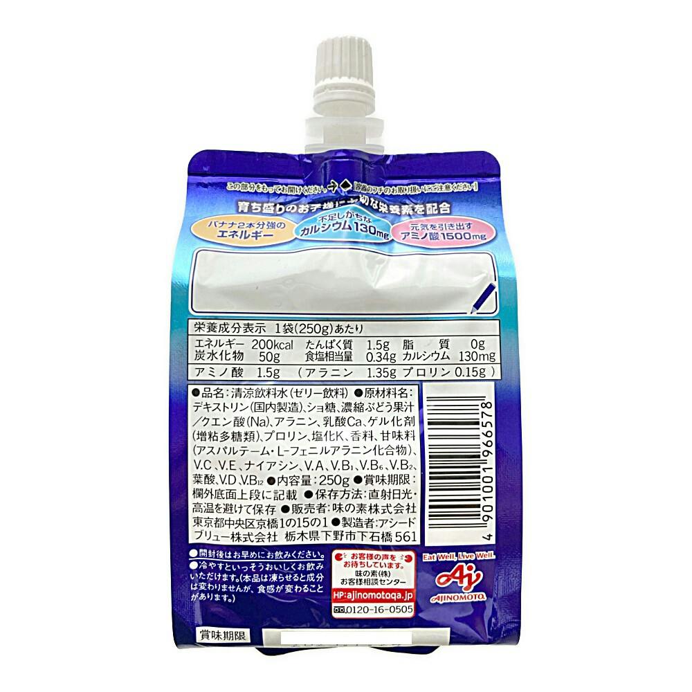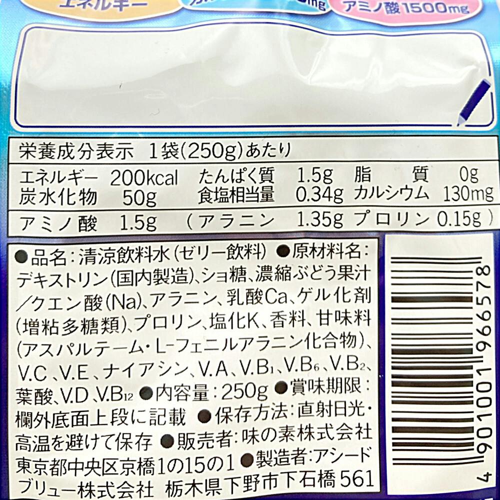 デキストリン(国内製造)、ショ糖、濃縮ぶどう果汁/クエン酸(Na)、アラニン、乳酸Ca、ゲル化剤(増粘多糖類)、プロリン、塩化K、香料、甘味料(アスパルテーム・L-フェニルアラニン化合物)、V.C、V.E、ナイアシン、V.A、V.B1、V.B6、V.B2、葉酸、V.D、V.B12