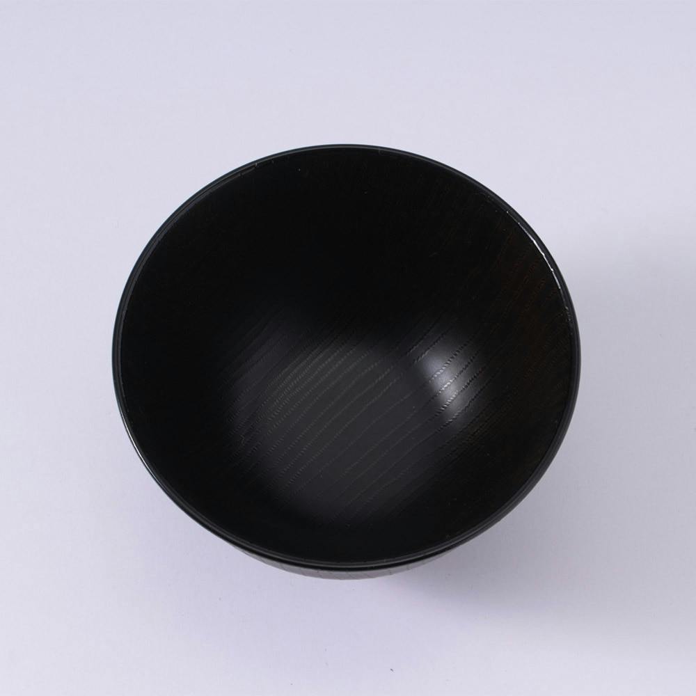 外側に反った形の汁椀で木目形状のこげ茶色の汁椀です。