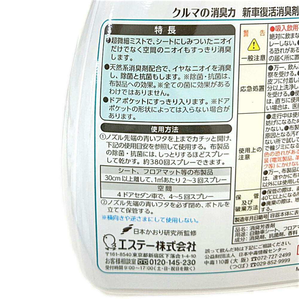 ●加熱式タバコにも効く!●タバコ臭、エアコン臭、汗臭、揚げ物臭に●使用目安/【シート、フロアマット等の布製品】:30cm以上離して、1平方メートルあたり2~3回スプレー 【空間】:4ドアセダン車で、4~5回スプレー●約380回スプレーできます。