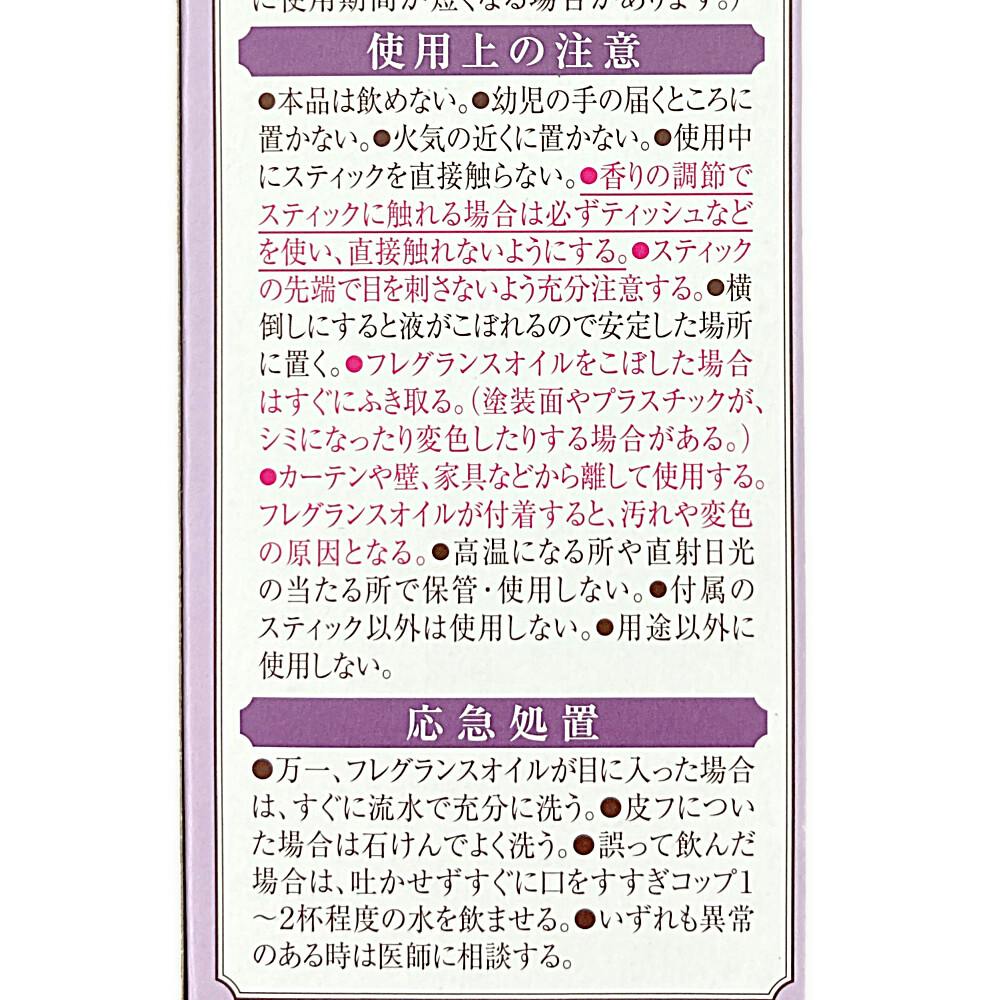 ●本品は飲めない ●幼児の手の届くところに置かない ●火気の近くに置かない ●使用中にスティックを直接触らない ●香りの調節でスティックに触れる場合は必ずティッシュなどを使い直接触れないようにする ●スティックの先端で目を刺さないよう充分注意する など