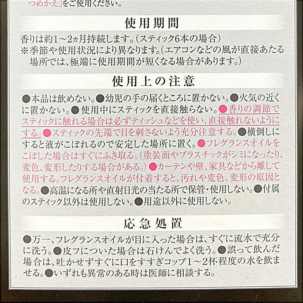 ●本品は飲めない ●幼児の手の届くところに置かない ●火気の近くに置かない ●使用中にスティックを直接触らない ●香りの調節でスティックに触れる場合は必ずティッシュなどを使い直接触れないようにする ●スティックの先端で目を刺さないよう充分注意する など