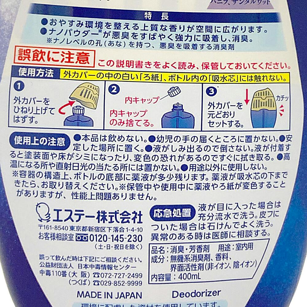 ●夜の静けさと深い夢の時間を表現した、ラベンダーがベースの優しく穏やかな香り。●おやすみ環境を整える上質な香りが空間に広がります。●ナノパウダーが悪臭をすばやく強力に吸着し、消臭。※ナノレベルの孔(あな)を持つ、悪臭を吸着する消臭剤