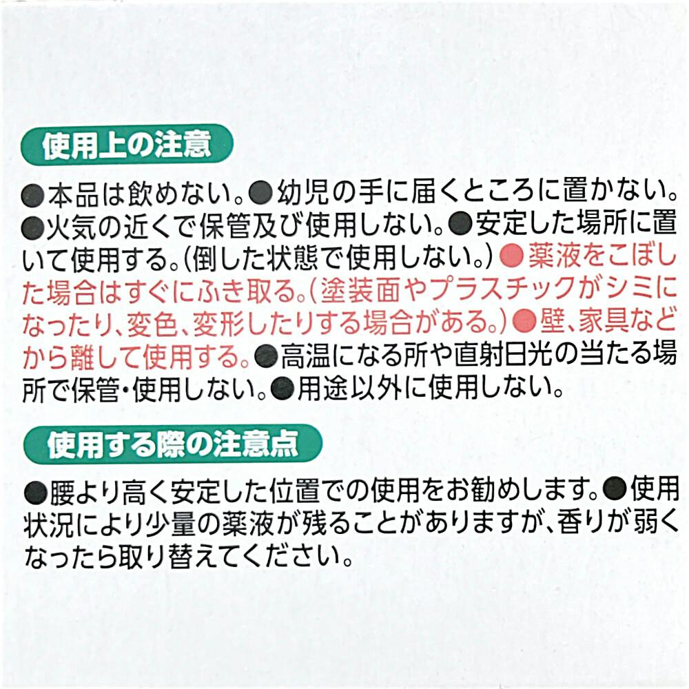 使用する際の注意点/腰より高く安定した位置での使用をお勧めします。使用状況により少量の薬液が残ることがありますが、香りが弱くなったら取り替えてください。