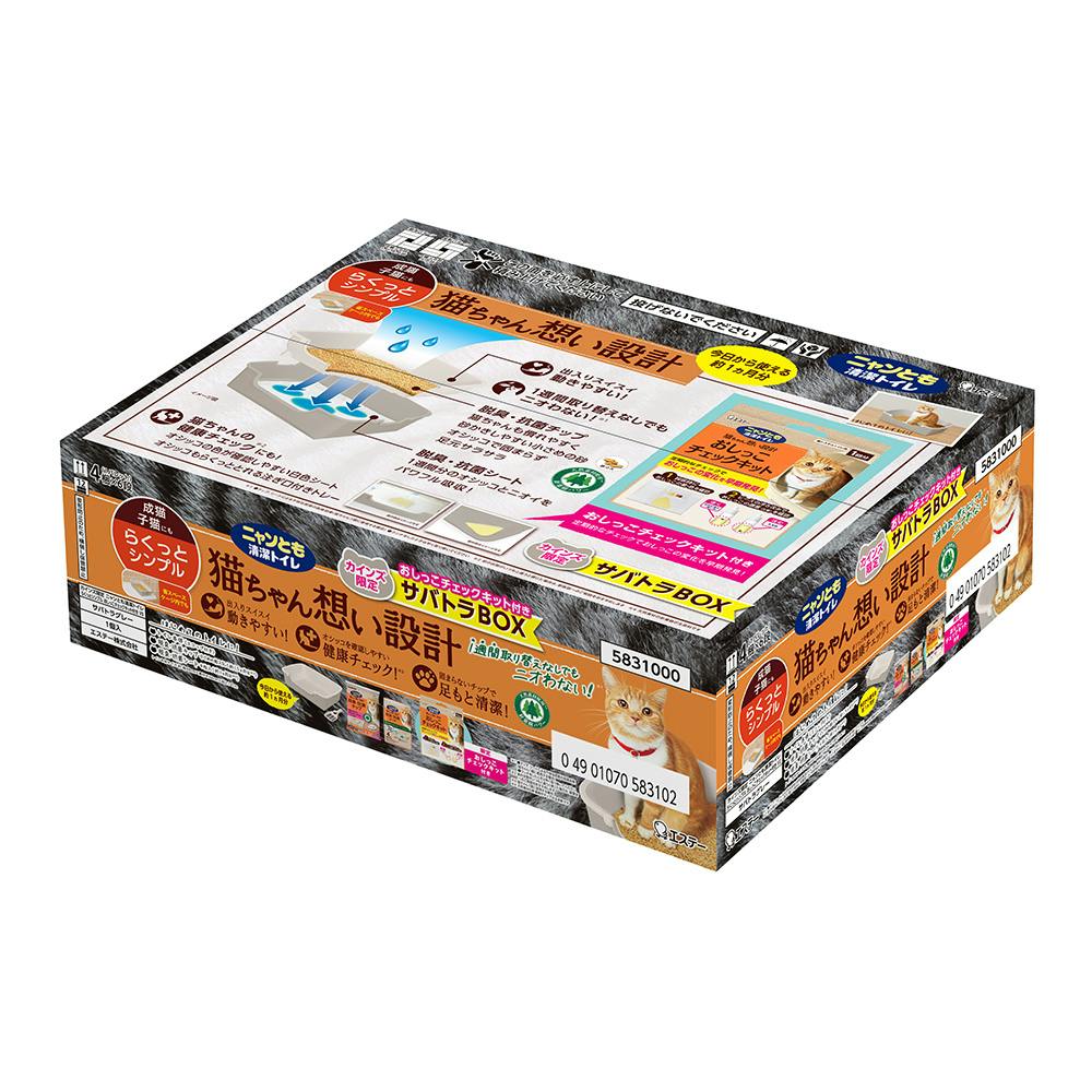 トイレ本体(スノコ、トレー、専用スコップ付き) 脱臭・抗菌チップ 小さめの粒 2.5L/約1.5ヶ月分(脱臭・抗菌チップは別売りもあります。) 脱臭・抗菌シート 4枚入り/約1ヶ月分(脱臭・抗菌シートは別売りもあります。)ニャンとも清潔トイレ おしっこチェックキット付