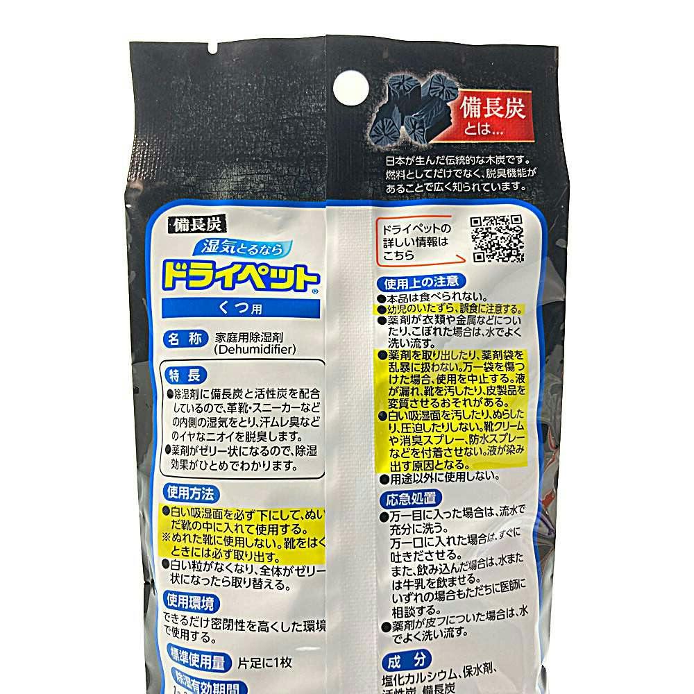 ●除湿剤に備長炭と活性炭を特殊配合しているので、湿気を取りながら、気になるニオイを脱臭します。●湿気を吸うと薬剤がゼリー状になり、除湿効果がひとめでわかります。●革靴・スニーカーなどの内側の湿気をとり、汗ムレ臭などのイヤなニオイを脱臭します。