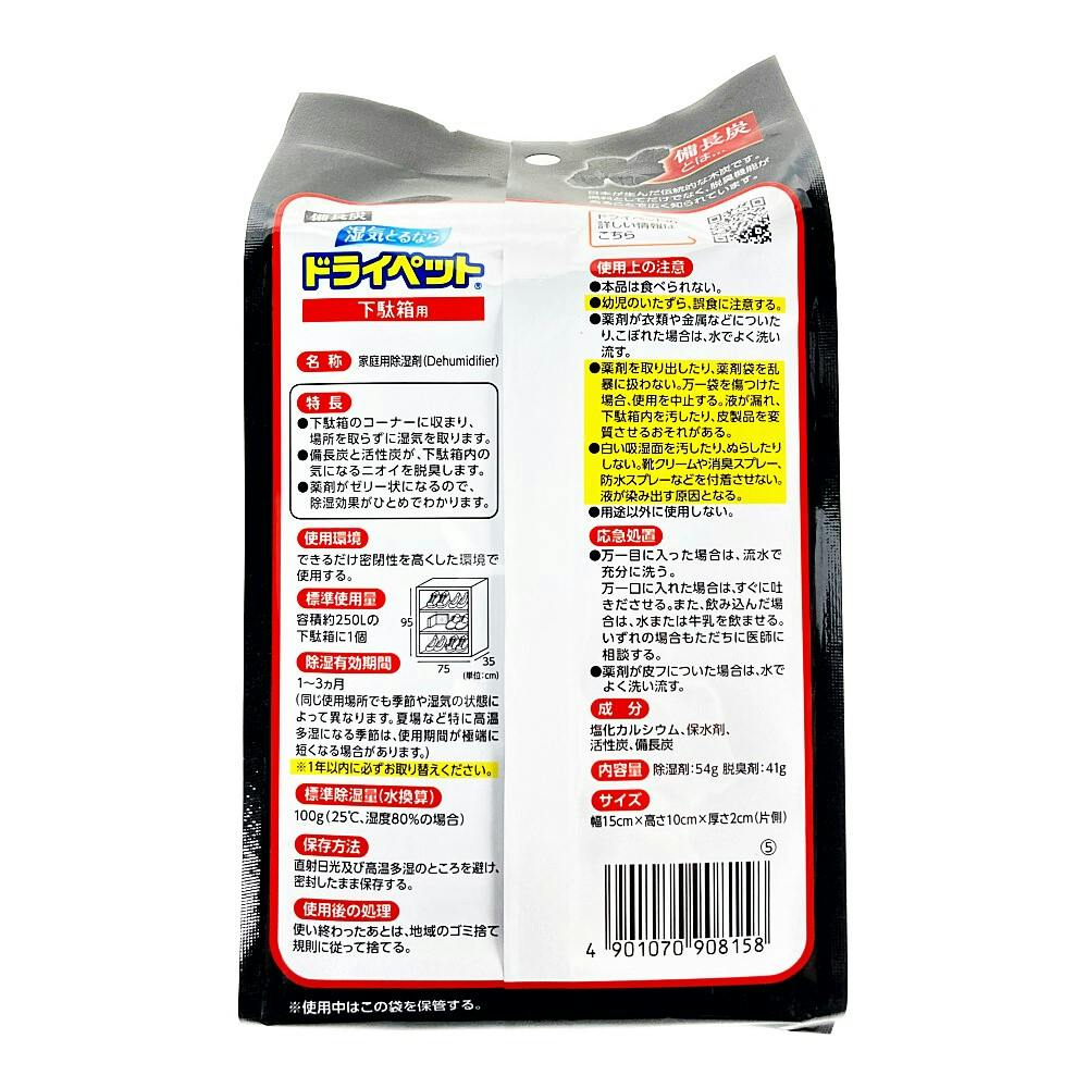 ●除湿剤に備長炭と活性炭を特殊配合しているので、湿気を取りながら、気になるニオイを脱臭します。●湿気を吸うと薬剤がゼリー状になり、除湿効果がひとめでわかります。●下駄箱コーナーに収まり、場所をとらずに湿気を取ります。