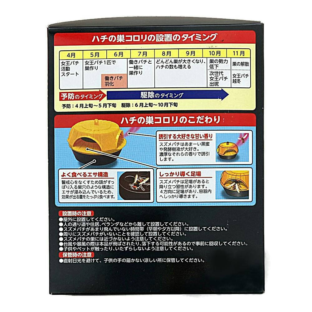 設置時の注意/屋外に設置してください。人の通り道や住居、ベランダなどから離して設置して下さい。スズメバチがあまり飛んでいない時間帯(早朝や夕方以降)に設置してください。周りにスズメバチがいないことを確認して設置して下さい など