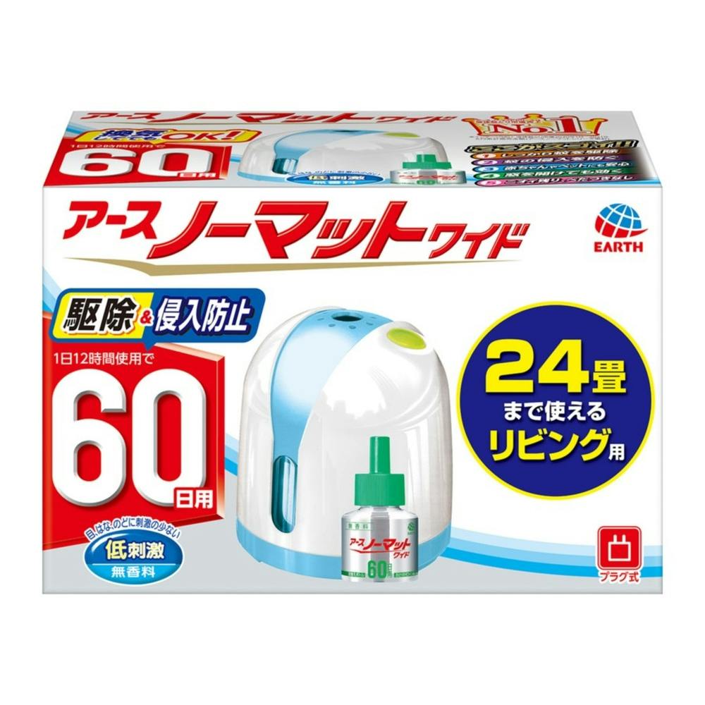 ●アースノーマットワイドは薬剤濃度が2倍だから、10~24畳までの広い範囲でも効果を発揮します。●広いリビングでの使用におすすめのノーマットです。●専用の取替えボトルならどれでも使用可能(無香料・微香性どちらも使えます)