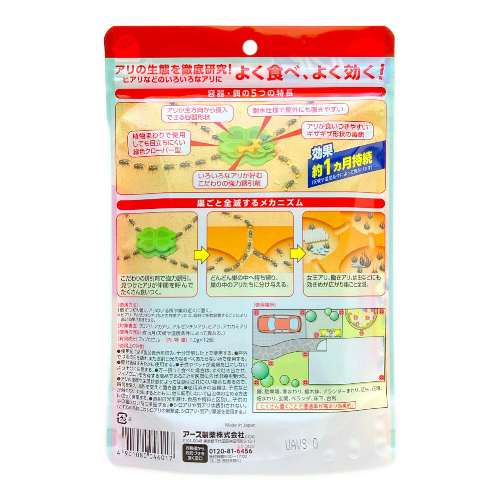 ●アリの生態を徹底研究!ヒアリなどのいろいろなアリに●よく食べ、よく効く!●アリが全方向から侵入できる容器形状●耐水仕様で屋外にも置きやすい●植物まわりで使用しても目立ちにくい緑色クローバー型●いろいろなアリが好むこだわりの強力誘引剤