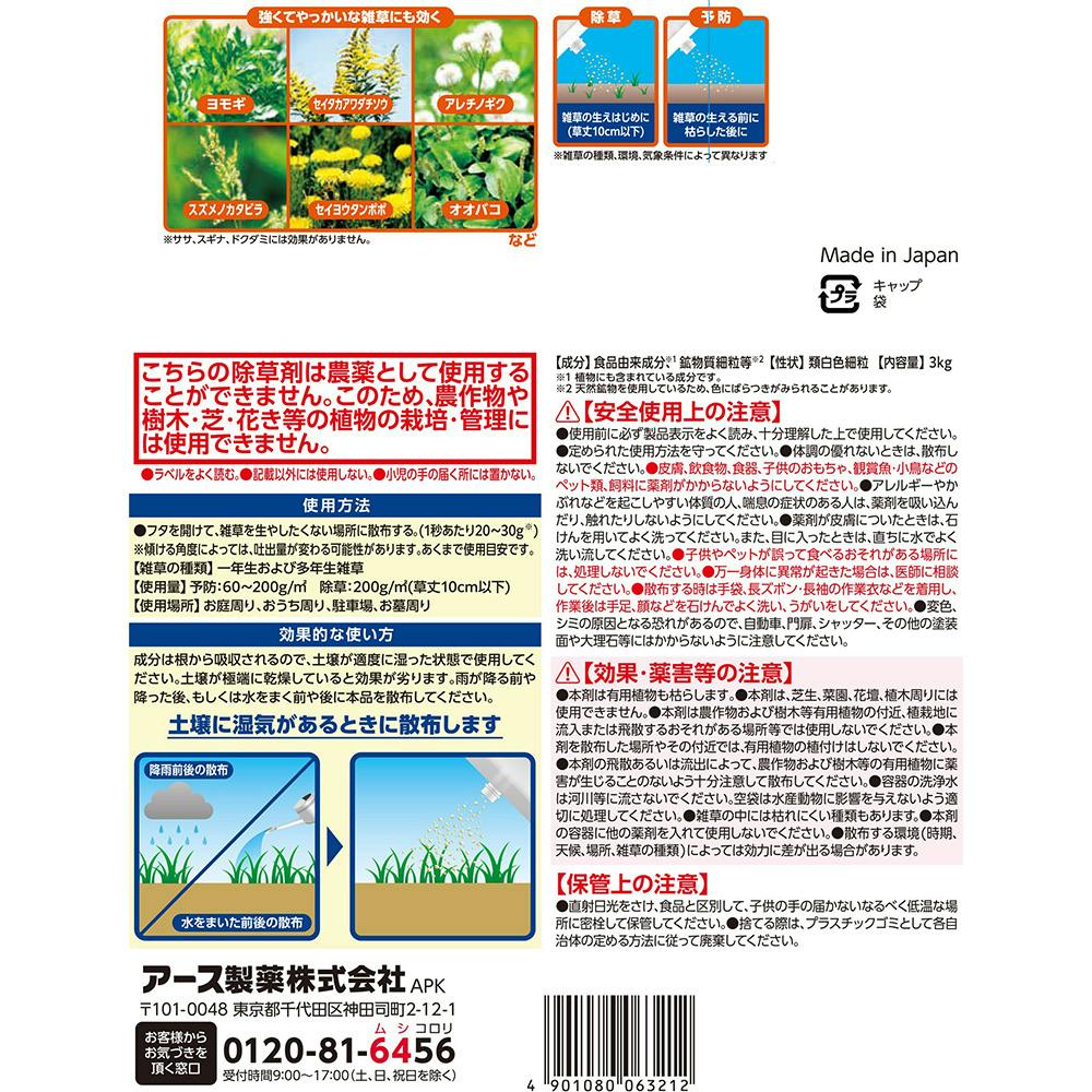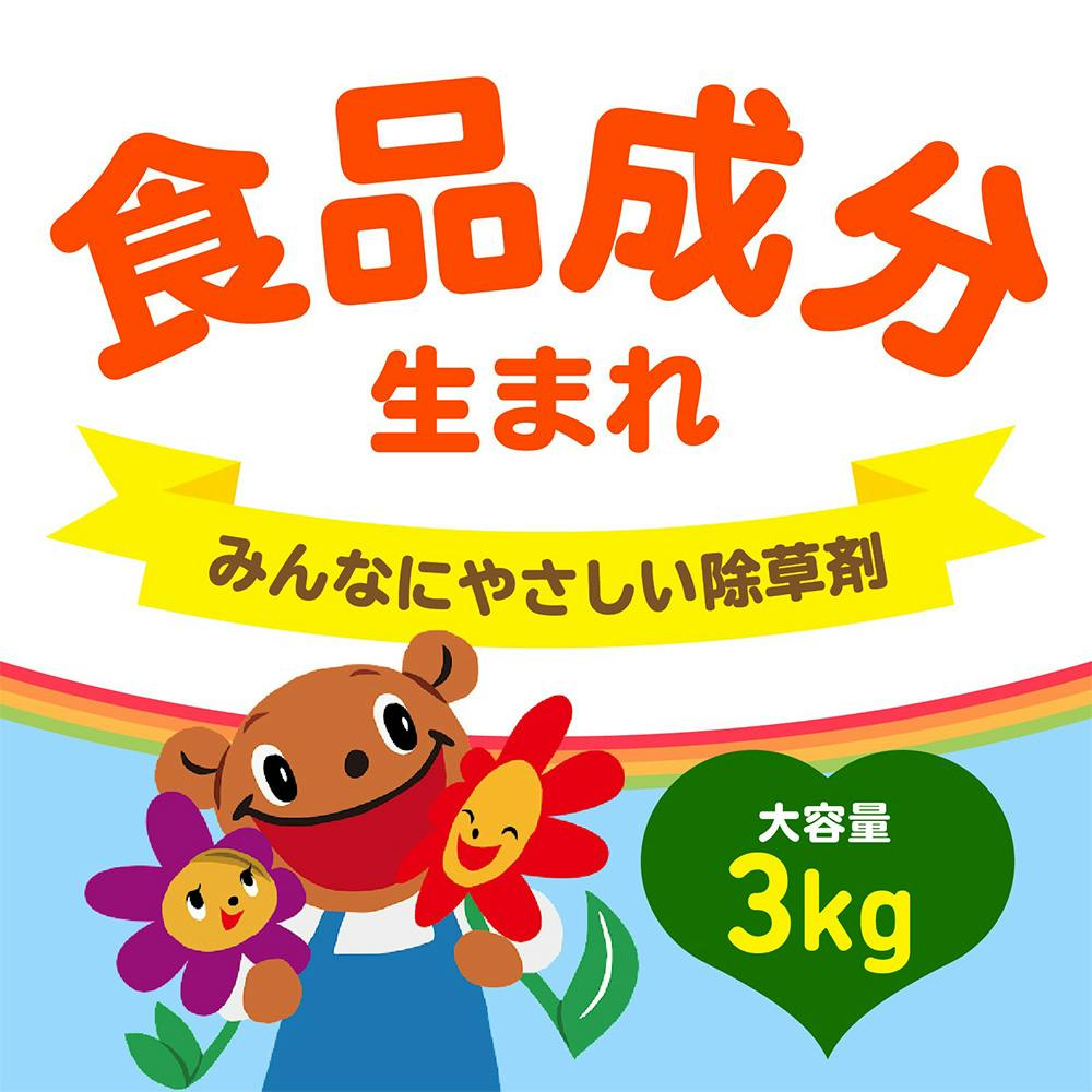食品成分から作られた粒タイプの除草剤。根まで枯らして、まいてから約3ヵ月間雑草の繁殖を抑制します。たっぷり使える3㎏。