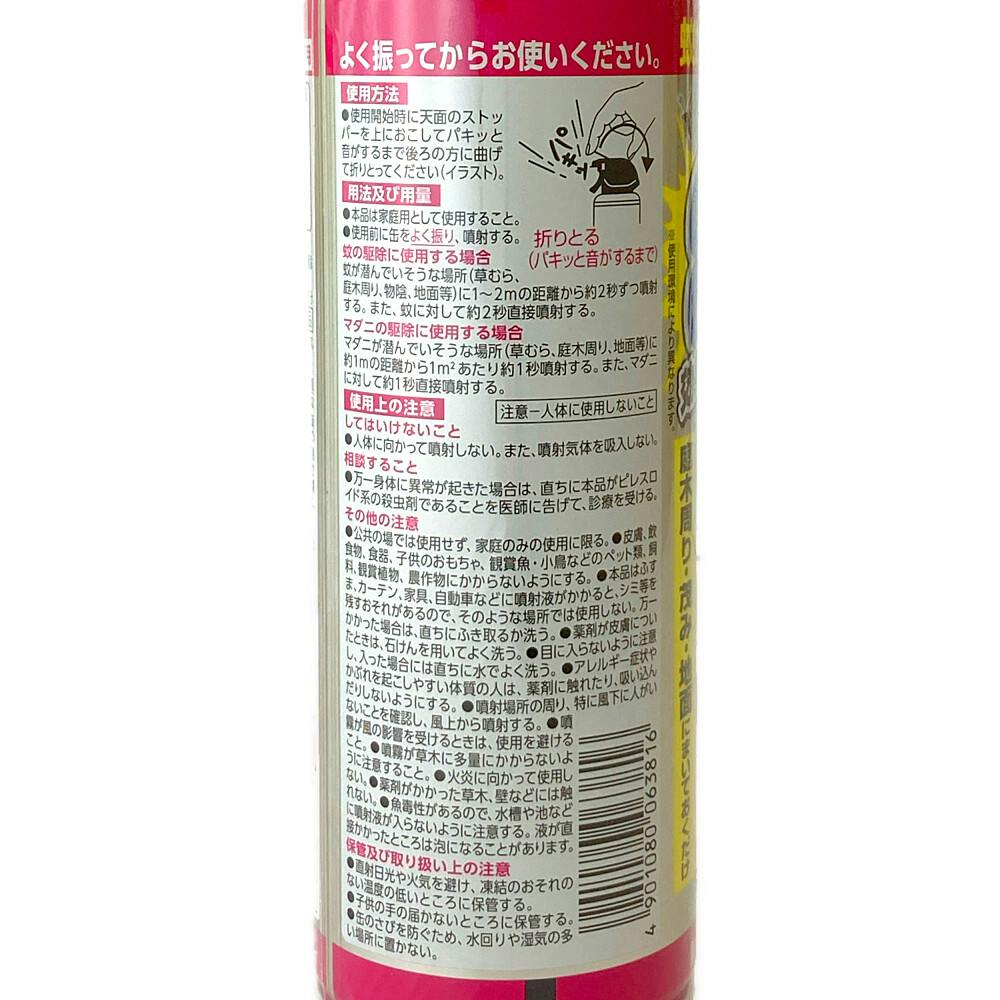 ●庭、畑、山作業前に作業スペース周りの地面茂みにスプレーするだけ ●ヤブ蚊を駆除して8時間(※天候、環境により異なります)よせつけない+マダニ駆除効果 ●植物にかかっても安心な無香料・水性タイプです