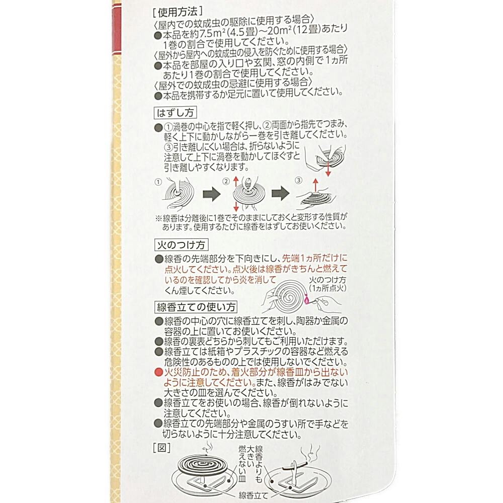 ●約12時間安定した効果を発揮するジャンボ渦巻です。(燃焼時間は使用環境により異なります)●使用方法/<屋内での蚊成虫の駆除に使用する場合>本品を約7.5平方メートル(4.5畳)~20平方メートル(12畳)あたり1巻の割合で使用してください。