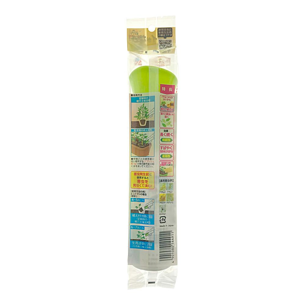 ●イヤなニオイがないから、室内で使える ●隠れた害虫にも効く ●効果長く続く、持続性 ●すばやく効きひろがる、速効性 ●苗を植える時、生育途中にも使える