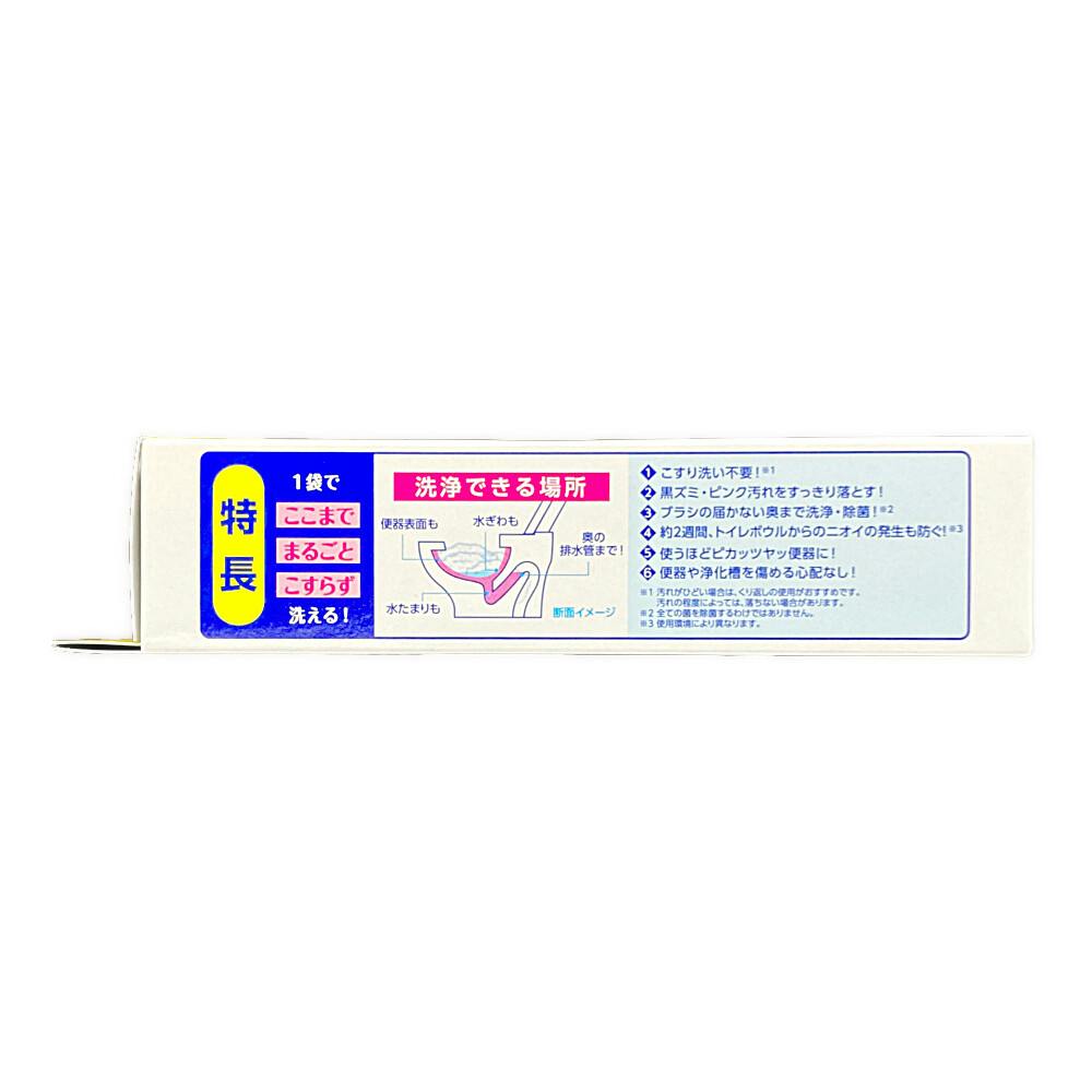 ●1袋でここまで、まるごと、こすらず洗える!1.こすり洗い不要!2.黒ズミ・ピンク汚れをすっきり落とす!3.ブラシの届かない奥まで洗浄・除菌!4.約2週間、トイレボウルからのニオイの発生も防ぐ!5.使うほどピカッツヤッ便器に!6.便器や浄化槽を傷める心配なし!