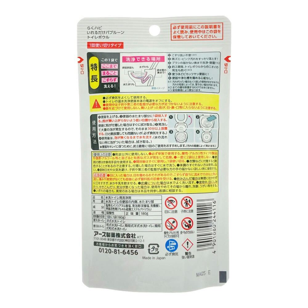 ●ブラシの届かない奥までまるごと洗える ●ニオイの発生も防ぐ!! ●脱ゴシゴシ洗い ●この1袋でここまでまるごとこすらず洗える!/洗浄できる場所:便器表面も、水ぎわも、水たまりも、排水管の奥まで!