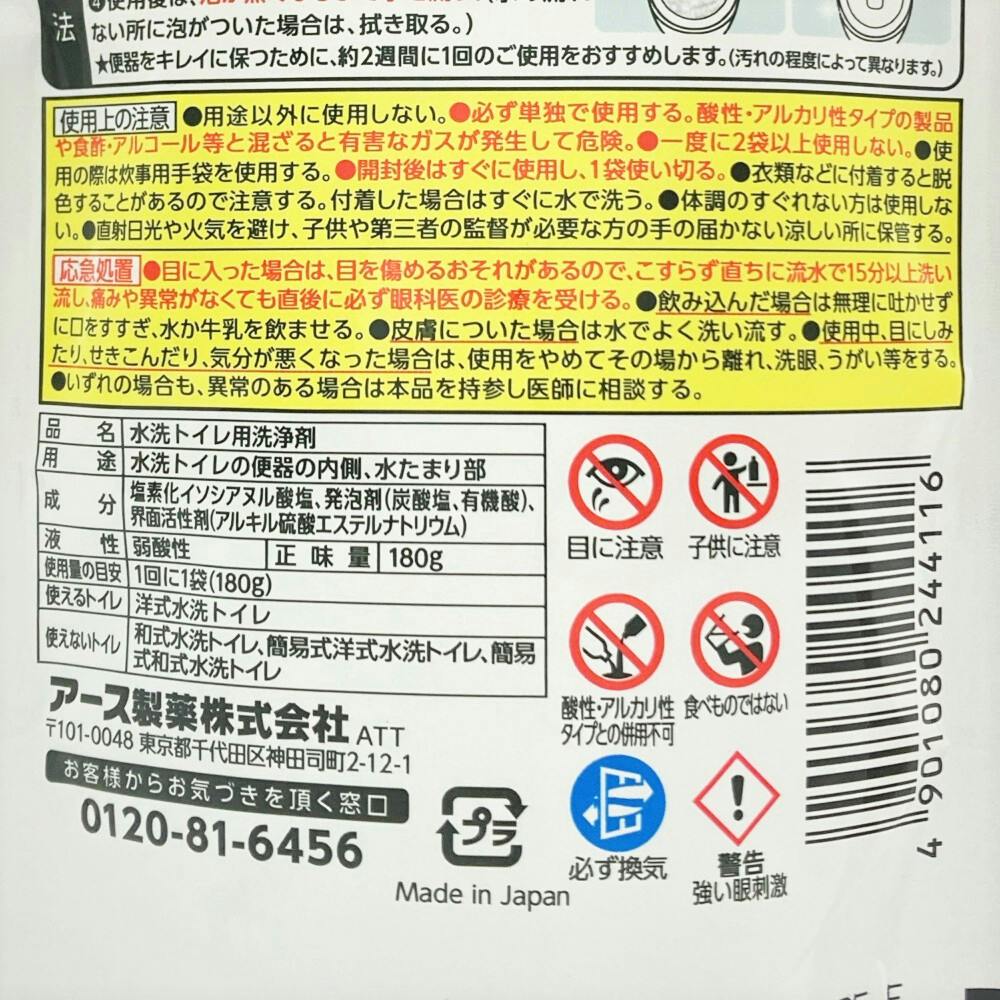 ●用途以外に使用しない。●必ず単独で使用する。酸性・アルカリ性タイプの製品や食酢・アルコール等と混ざると有害なガスが発生して危険。●一度に2袋以上使用しない。●使用の際は炊事用手袋を使用する。●開封後はすぐに使用し、1袋使い切る。など