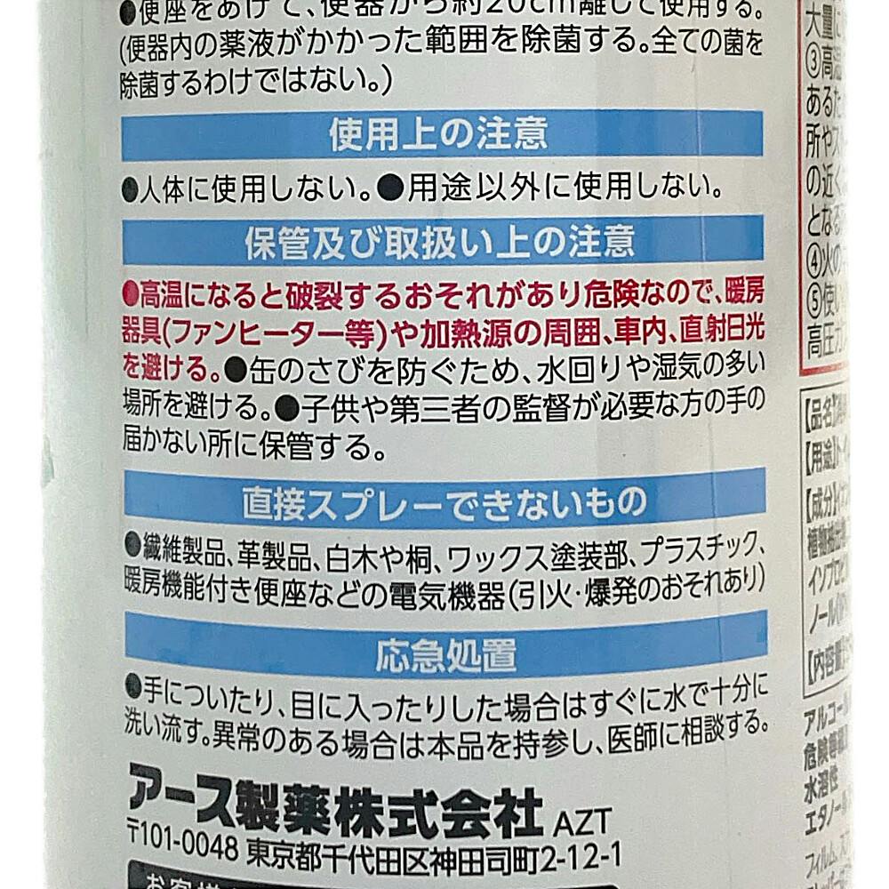 ●人体に使用しない。●用途以外に使用しない。(保管及び取扱い上の注意)/●高温になると破裂する恐れがあり危険なので、暖房器具(ファンヒーター等)や加熱源の周囲、車内、直射日光を避ける。●缶のさびを防ぐため、水回りや湿気の多い場所を避ける。など