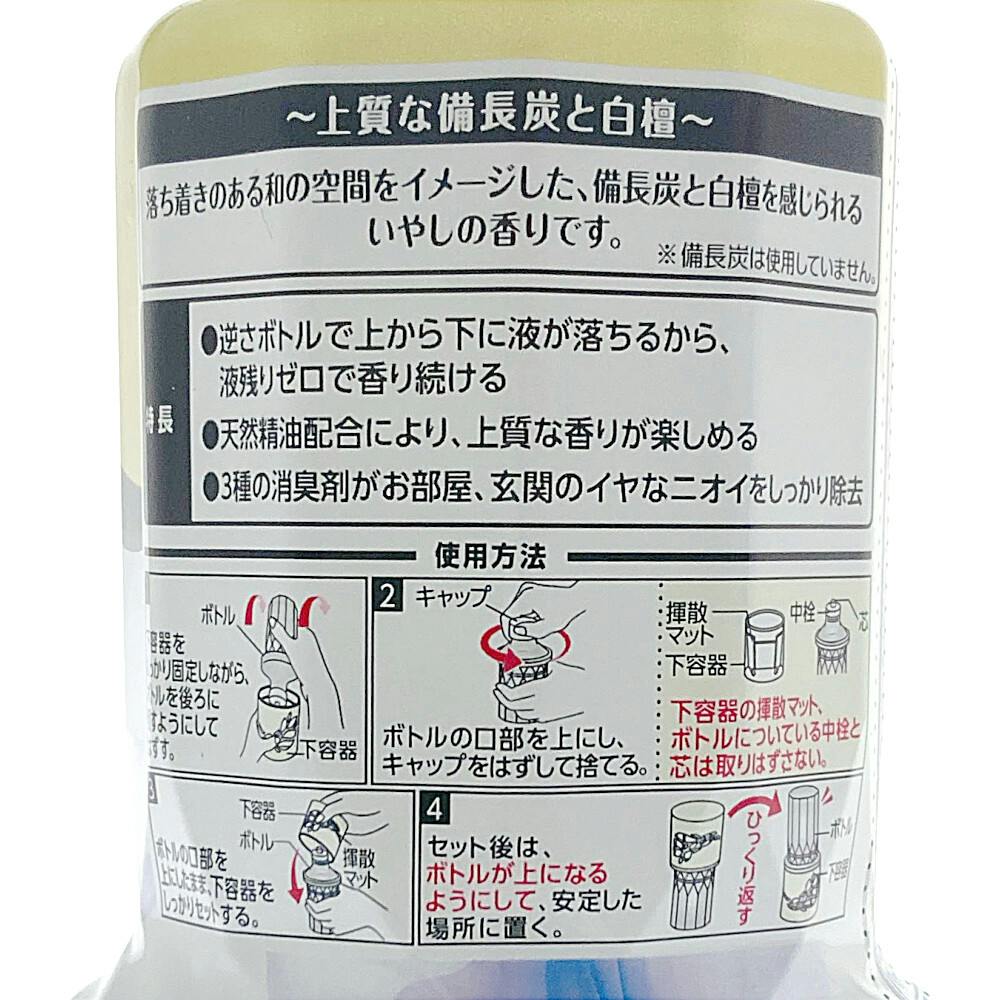 ●逆さボトルで上から下に液が落ちるから、液残りゼロで香り続ける ●天然精油配合により、上質な香りが楽しめる ●3種の消臭剤がお部屋、玄関のイヤなニオイをしっかり除去