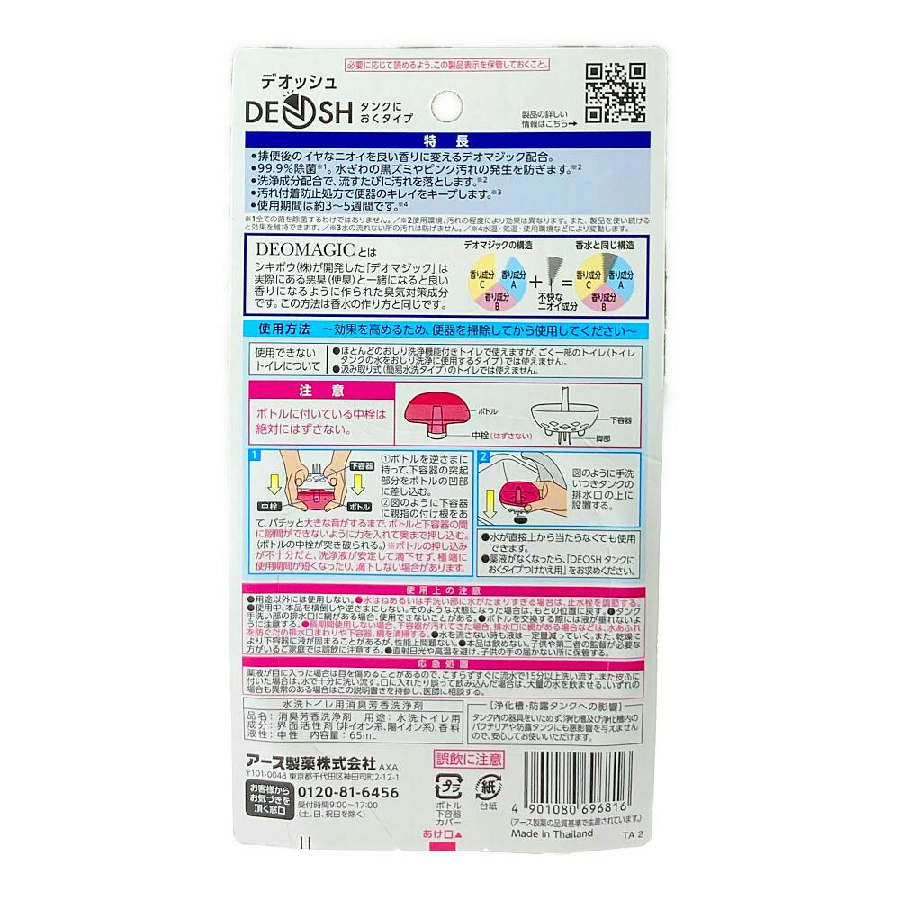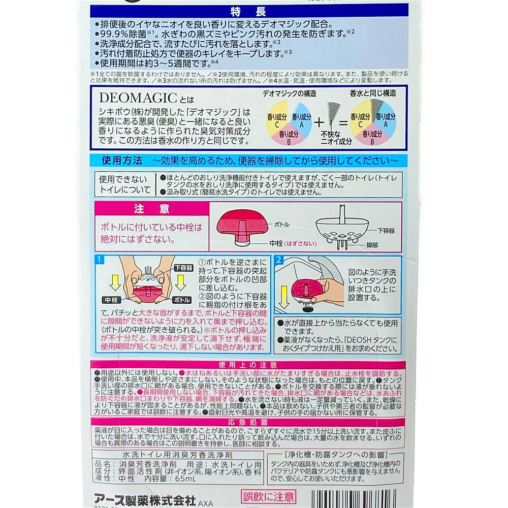 ●排便後のイヤなニオイを良い香りに変えるデオマジック配合 ●99.9%除菌。水ぎわの黒ズミやピンク汚れの発生を防ぎます ●洗浄成分配合で、流すたびに汚れを落とします ●汚れ付着防止処方で便器のキレイをキープします