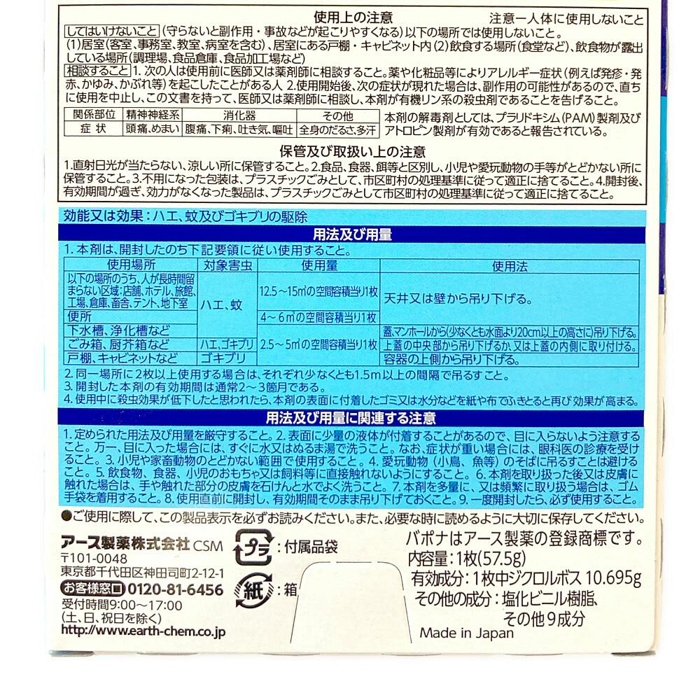 1.本剤は、開封したのち下記要領に従い使用すること【使用場所】以下の場所のうち、人が長時間留まらない区域:店舗、ホテル、旅館、工場、倉庫、畜舎、テント、地下室●対象害虫:ハエ、蚊●使用量:12.5~15立方メートルの空間容積当り1枚●使用法:天井又は壁から吊り下げる。等