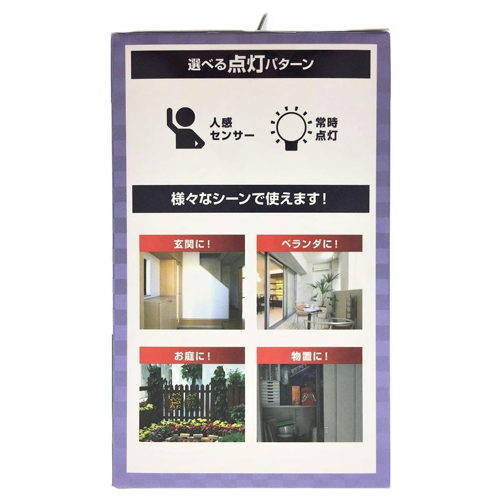 ●センサーモードと常時点灯モードの点灯切替付き。●センサーモード時は、暗い時にセンサーが人を検知すると自動で点灯し、約10秒後に自動で消灯します。
