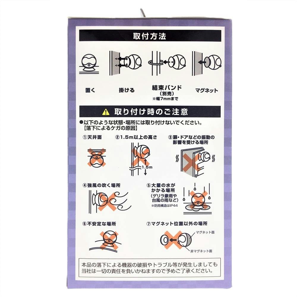 ●置いても結束バンド(別売)で取り付けても使える!●乾電池式ですのでコンセントのない場所でもご使用いただけます。●軒下などの屋外に設置できる防雨仕様(IP44 防沫形)