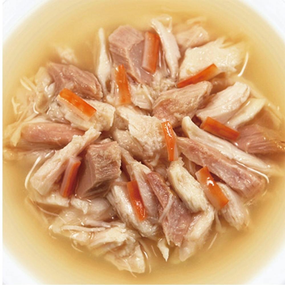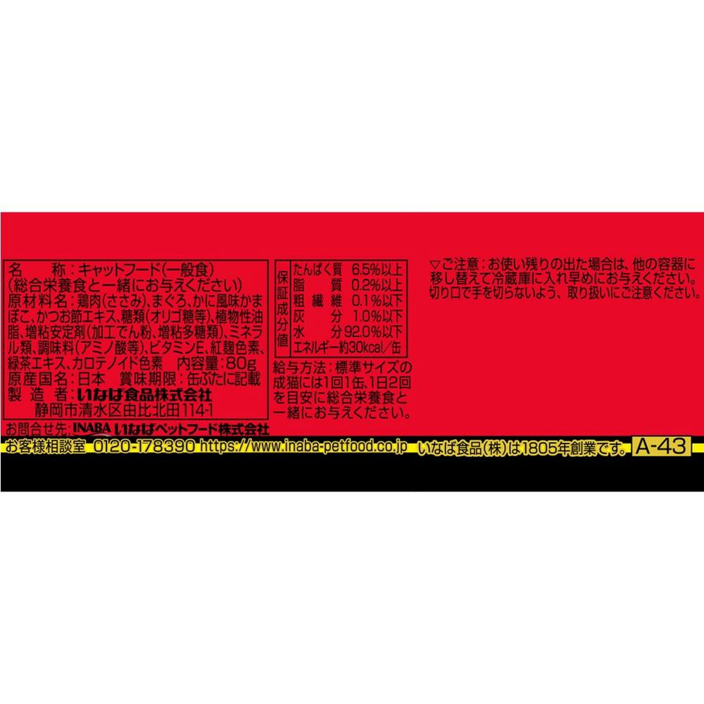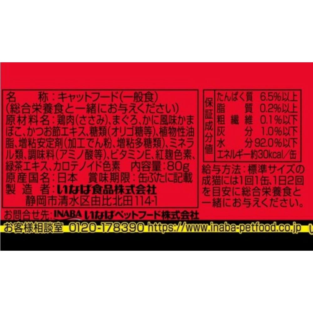 鶏肉、まぐろ、かに風味かまぼこ、かつお節エキス、糖類(オリゴ糖等)、植物性油脂、増粘剤(加工でん粉)、ミネラル類、調味料(アミノ酸等)、増粘多糖類、ビタミンE、紅麹色素、緑茶エキス、カロテノイド色素
