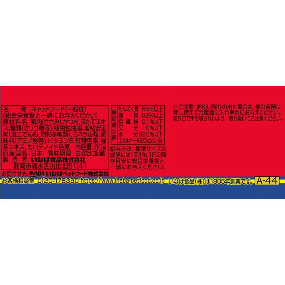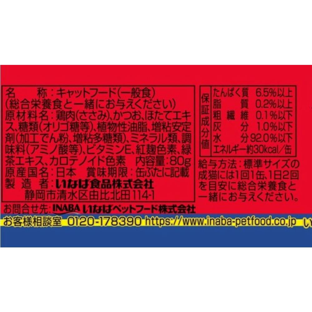 鶏肉、かつお、ほたてエキス、糖類(オリゴ糖等)、植物性油脂、増粘剤(加工でん粉)、ミネラル類、調味料(アミノ酸等)、増粘多糖類、ビタミンE、紅麹色素、緑茶エキス、カロテノイド色素