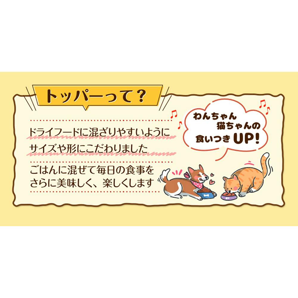 愛犬の体重に応じて裏面表記を目安におやつとしてそのまま与えるか、主食(ドライフード、缶詰等)に混ぜてお与え下さい。