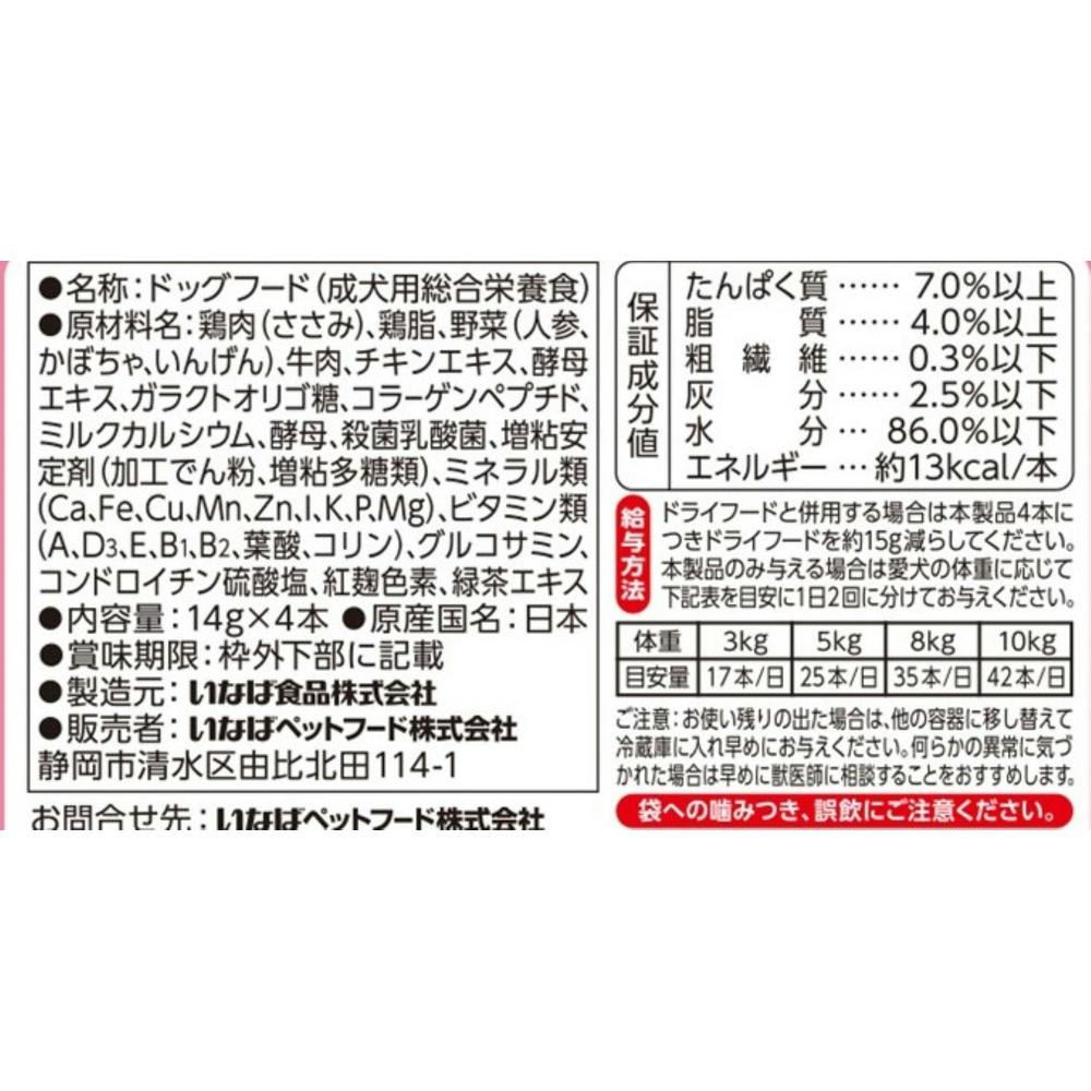 鶏肉(ささみ)、鶏脂、野菜(人参、かぼちゃ、いんげん)、牛肉、チキンエキス、酵母エキス、ガラクトオリゴ糖、コラーゲンペプチド、サメ軟骨抽出物、ミルクカルシウム、酵母、殺菌乳酸菌、増粘安定剤、ミネラル類、ビタミン類、グルコサミン、紅麹色素、緑茶エキス