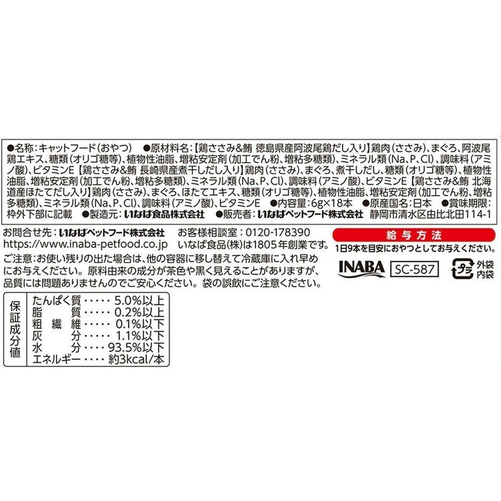 【鶏ささみ&鮪北海道産ほたてだし入り】鶏肉(ささみ)、まぐろ、ほたてエキス、糖類(オリゴ糖等)、植物性油脂、増粘安定剤(加工でん粉、増粘多糖類)、ミネラル類(Na、P、Cl)、調味料(アミノ酸)、ビタミンE【鶏ささみ&鮪徳島県産阿波尾鶏だし入り】鶏肉(以下略