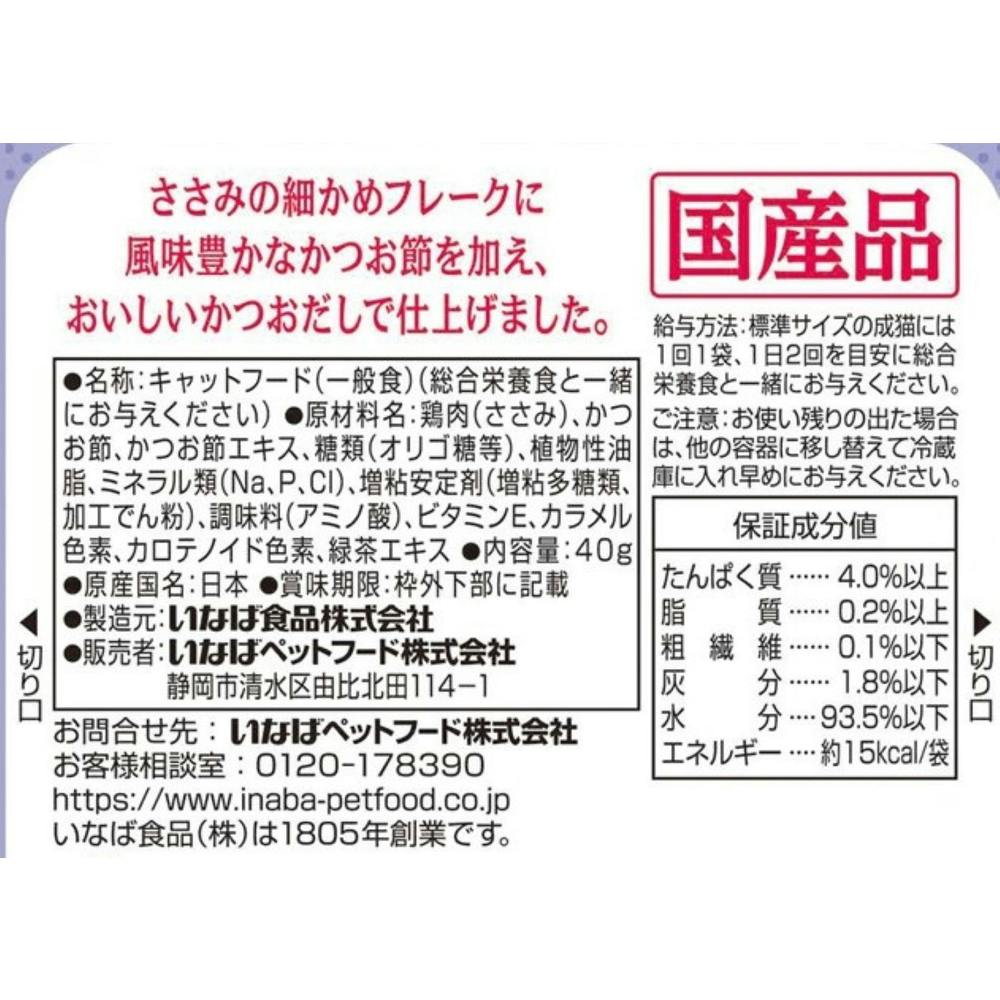 鶏肉(ささみ)、かつお節、かつお節エキス、糖類(オリゴ糖等)、植物性油脂、ミネラル類、増粘多糖類、調味料(アミノ酸等)、増粘剤(加工でん粉)、ビタミンE、カラメル色素、カロテノイド色素、緑茶エキス