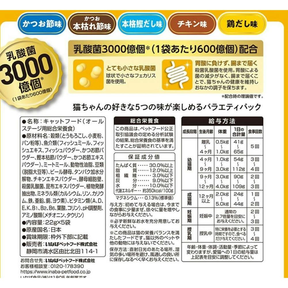 穀類(とうもろこし、小麦粉、パン粉等)、魚介類、ミートミール、動物性油脂、豆類、ビール酵母、タンパク加水分解物、チキンエキスパウダー、酵母細胞壁、殺菌乳酸菌、昆布エキスパウダー、植物発酵抽出物、ミネラル類、ビタミン類、アミノ酸類、pH調整剤