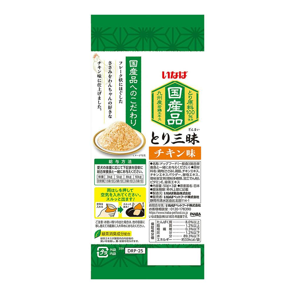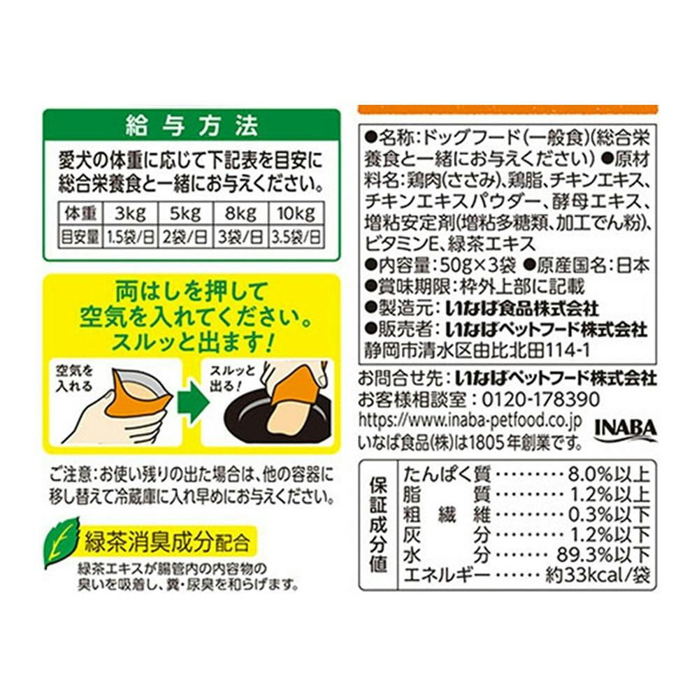鶏肉(ささみ)、鶏脂、チキンエキス、チキンエキスパウダー、酵母エキス、増粘安定剤(増粘多糖類、加工でん粉)、ビタミンE、緑茶エキス