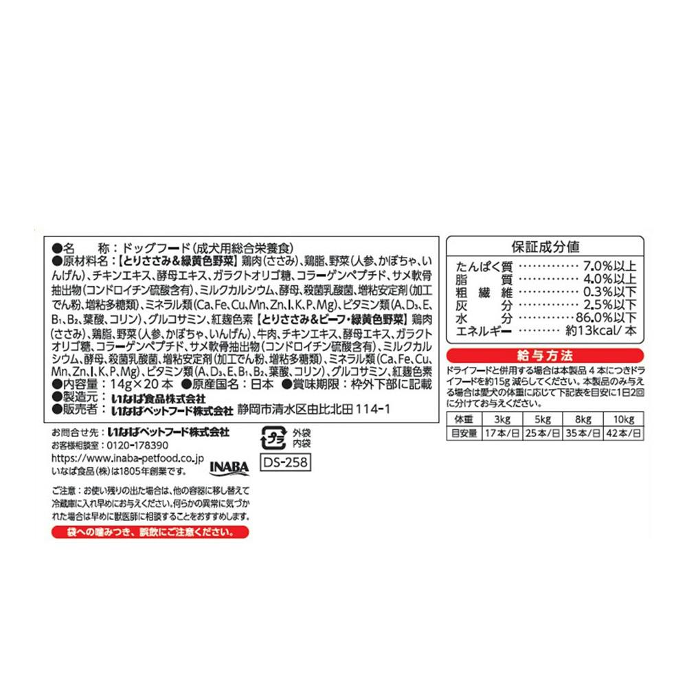 【とりささみ&緑黄色野菜】鶏肉(ささみ)、鶏脂、野菜(人参、かぼちゃ、いんげん)、チキンエキス、酵母エキス、ガラクトオリゴ糖、コラーゲンペプチド、サメ軟骨抽出物(コンドロイチン硫酸含有)、ミルクカルシウム、酵母、殺菌乳酸菌、増粘安定剤(加工でん粉、増粘多糖