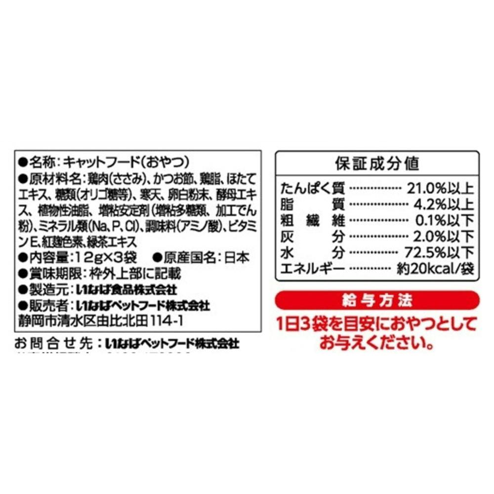 鶏肉(ささみ)、かつお節、鶏脂、ほたてエキス、糖類(オリゴ糖等)、寒天、卵白粉末、酵母エキス、植物性油脂、増粘多糖類、増粘剤(加工でん粉)、ミネラル類、調味料(アミノ酸等)、ビタミンE、紅麹色素、緑茶エキス