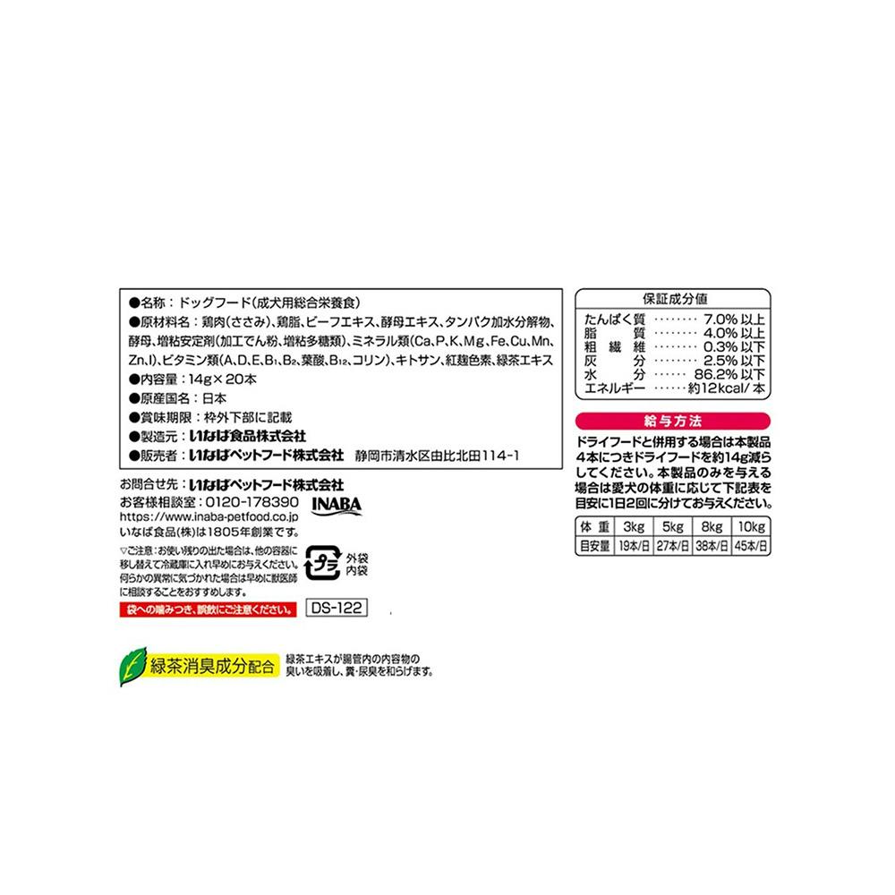 鶏肉(ささみ)、鶏脂、ビーフエキス、酵母エキス、タンパク加水分解物、増粘剤(加工でん粉)、ミネラル類(Ca、Fe、Cu、Mn、Zn、I、K)、増粘多糖類、ビタミン類(A、D3、E、B1、葉酸、B12、コリン)、キトサン、紅麹色素、緑茶エキス