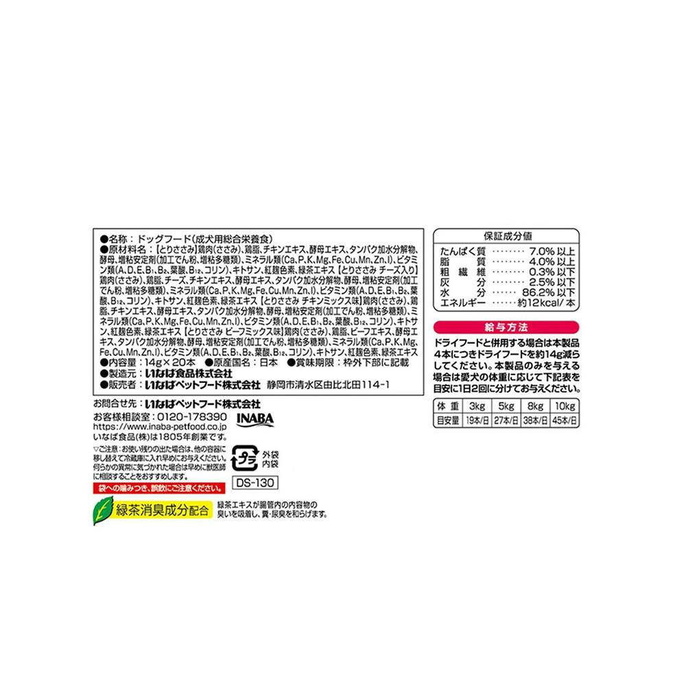 ●とりささみ/鶏肉(ささみ)、鶏脂、チキンエキス、酵母エキス、タンパク加水分解物、増粘安定剤(加工でん粉、増粘多糖類)、ミネラル類、ビタミン類、キトサン、紅麹色素、緑茶エキス●とりささみチーズ入り/鶏肉(ささみ)、鶏脂、チーズ、チキンエキス、酵母エキス、その他
