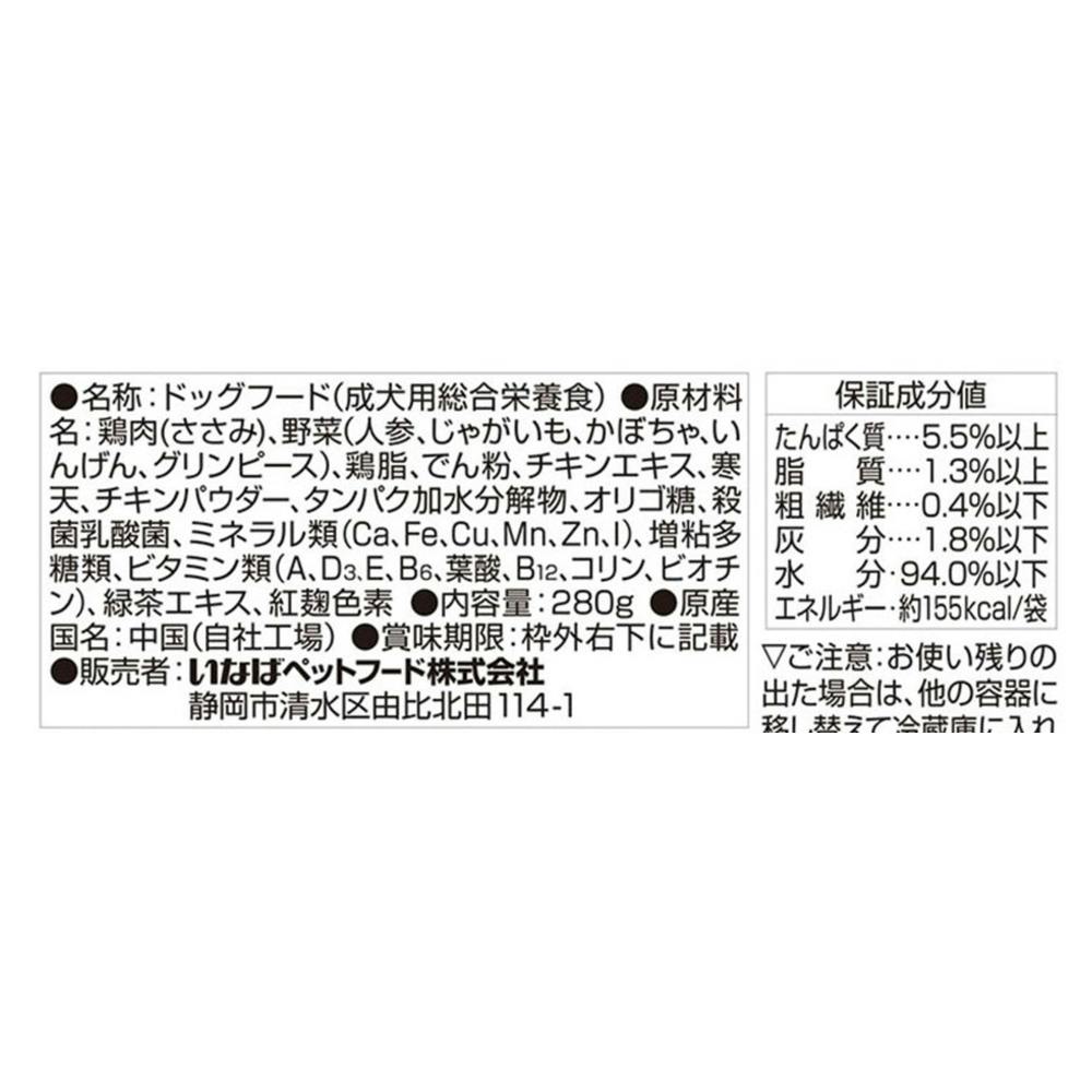 鶏肉(ささみ)、野菜(人参、じゃがいも、かぼちゃ、いんげん、グリンピース)、鶏脂、チキンエキス、寒天、チキンパウダー、タンパク加水分解物、オリゴ糖、殺菌乳酸菌、ミネラル類、増粘多糖類、ビタミン類、緑茶エキス、紅麹色素