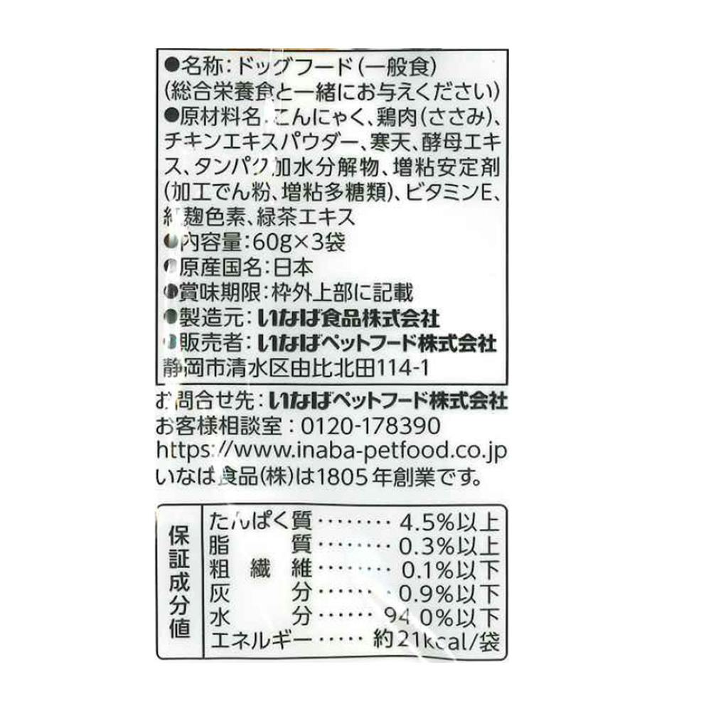こんにゃく、鶏肉(ささみ)、チキンエキスパウダー、寒天、酵母エキス、タンパク加水分解物、増粘安定剤(加工でん粉、増粘多糖類)、ビタミンE、紅麹色素、緑茶エキス
